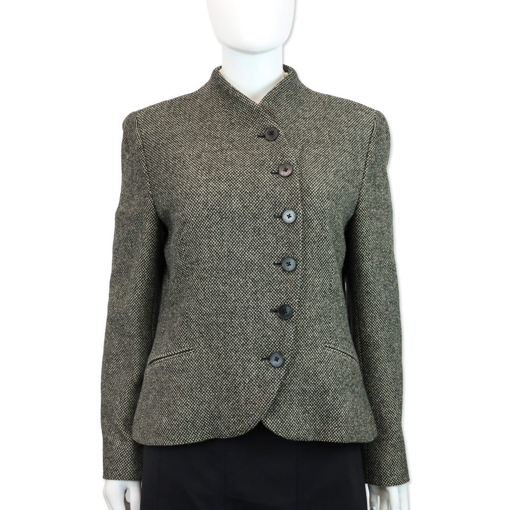 • Details: Houndstooth Tweed, Asymmetrical Button Closure, Welt Pockets (sewn shut), Button Cuffs