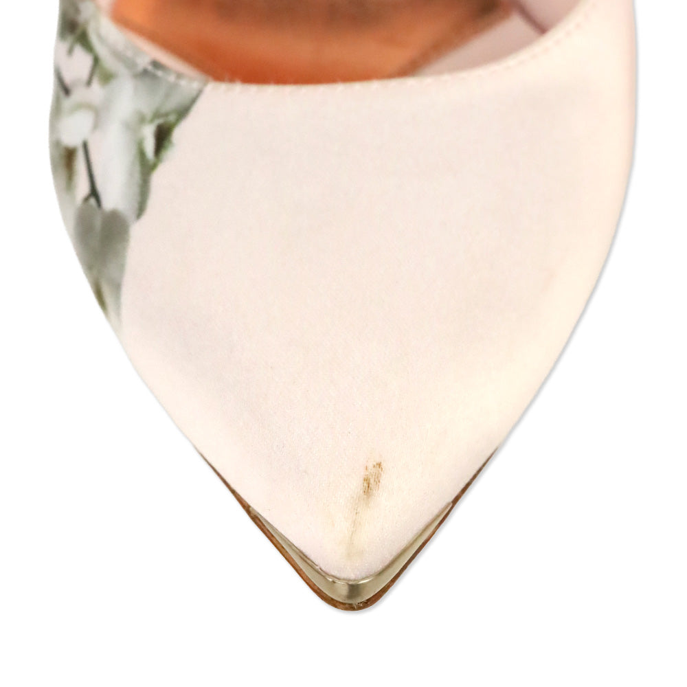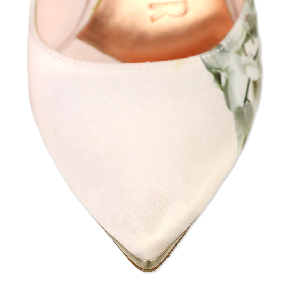 Ted Baker light pink satin pointed toe high heel pumps featuring a floral print with metal trimmed heel.