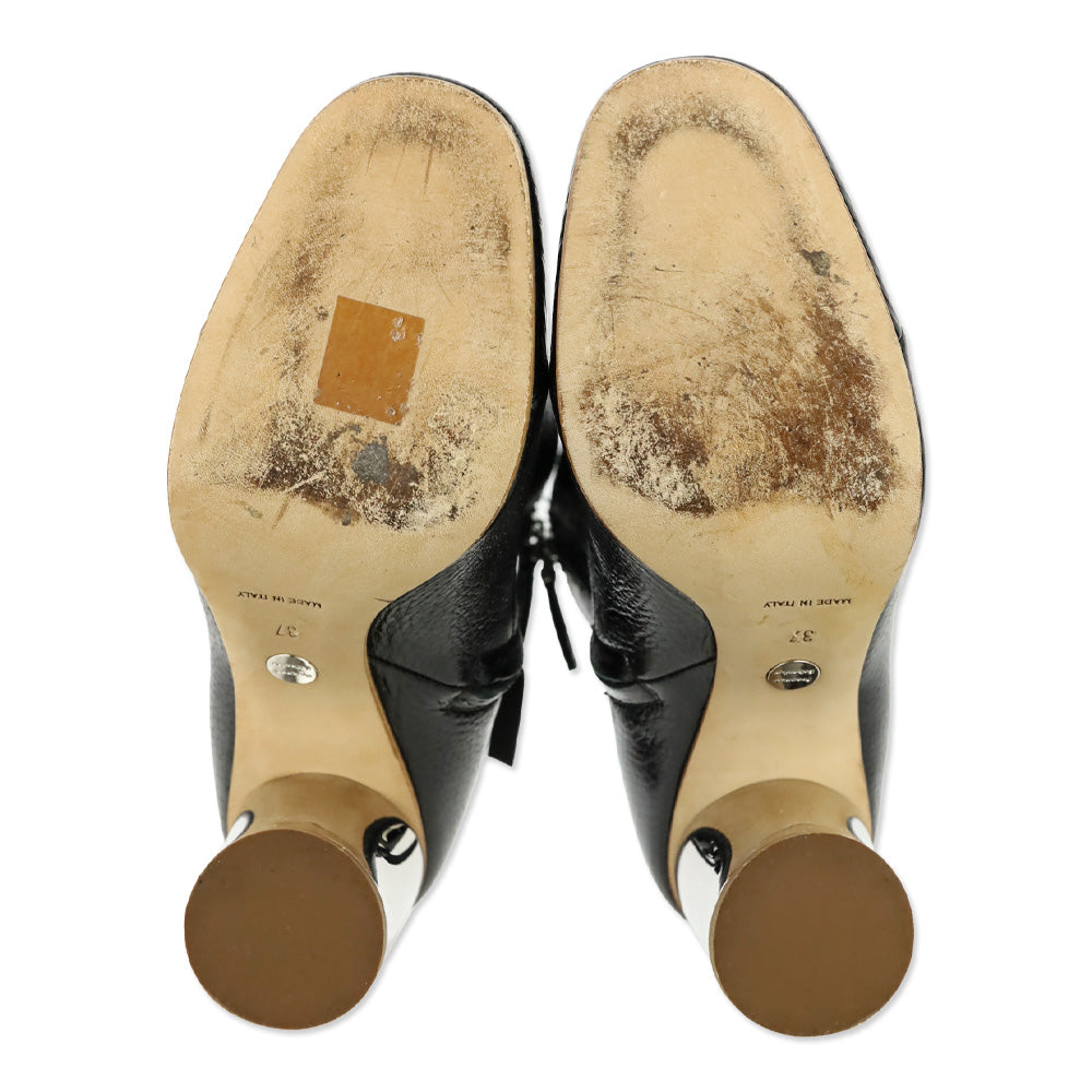 These Proenza Schouler leather boots combine urban edge with sophisticated design, featuring a distinctive back-lacing system and glossy leather that creates an elegant slouch. The contrasting patent cap toe and curved mirrored heel offer striking texture play.