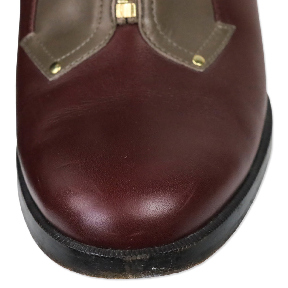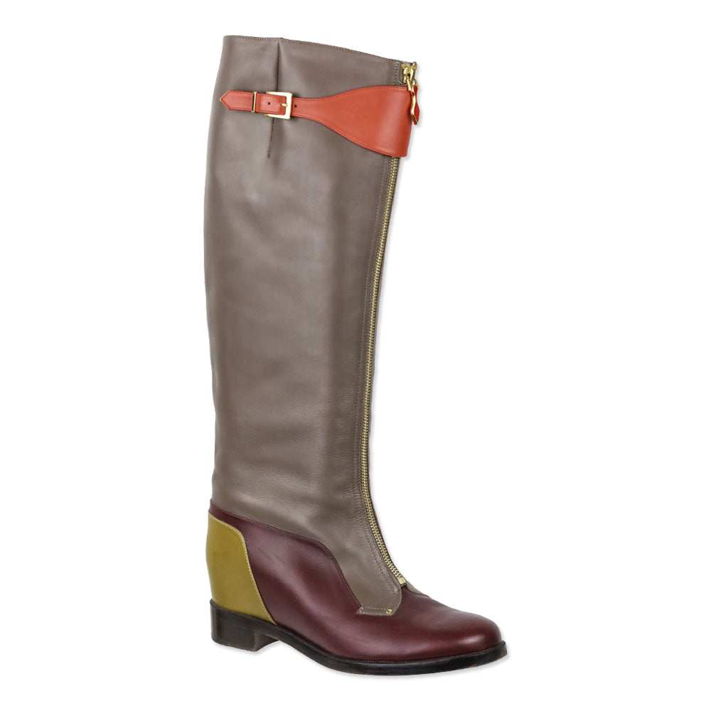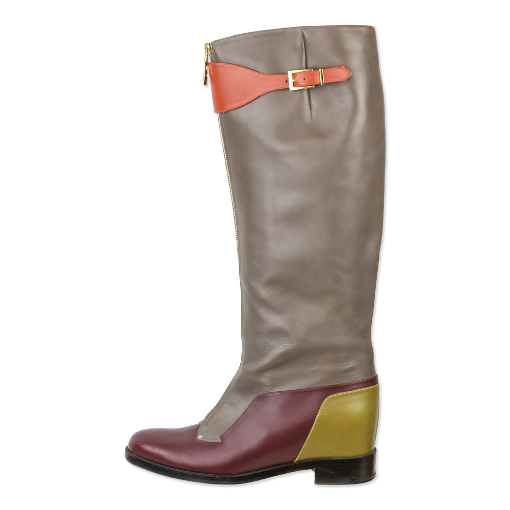 A masterpiece of tonal color-blocking, these Christian Louboutin knee-high riding boots are a sophisticated take on equestrian-inspired luxury. Crafted in Italy from supple calfskin leather, the palette features an elegant mix of taupe, rich burgundy, and deep mustard panels that create a striking, architectural silhouette. The design is defined by a bold gold-tone zip-front detail and a buckled strap at the ankle, merging functional hardware with high-fashion flair.