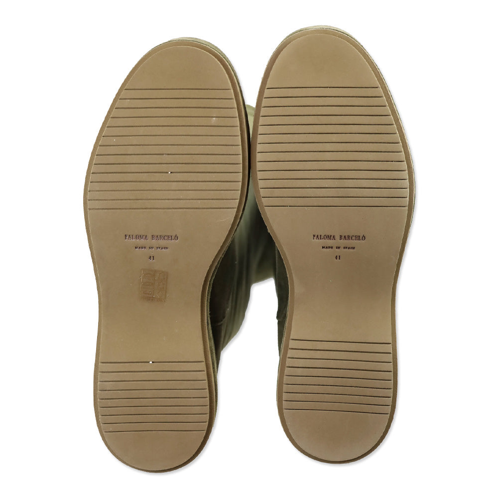 The Paloma Barcelo Roy Crosta Olive Suede Over-The-Knee Platform Boots offer a striking silhouette with luxurious olive suede and a comfortable platform sole. Perfect for making a statement at casual or cocktail events, these boots combine elegance and modern edge.