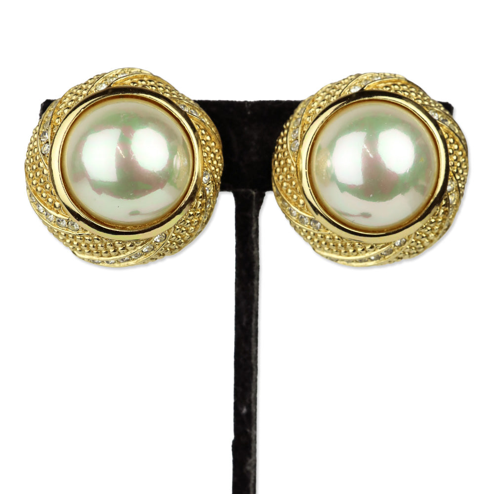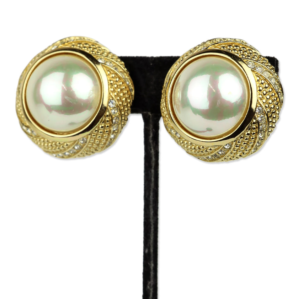 Christian Dior Large Gold Crystal Swirl Pearl Dome Clip-On Earrings