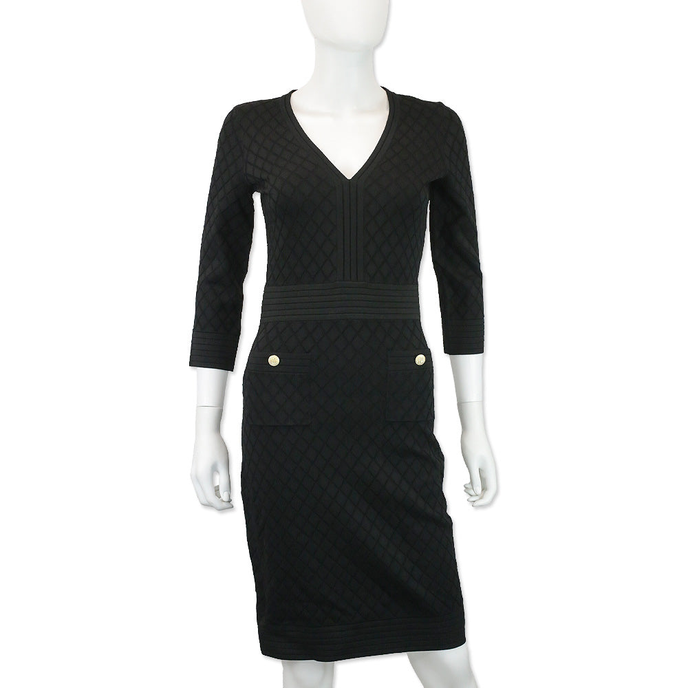 Carolina Herrera dress, Carolina Herrera sweater dress, black sweater dress, pointelle knit, V-neck dress, midi dress, designer dress, women's dress, size XS, new with tags, luxury fashion, pre-owned luxury, elegant dress, timeless style, designer knitwear, authentic Carolina Herrera, sophisticated look, chic dress, fashion resale, luxury brand, flawless fit, versatile style.