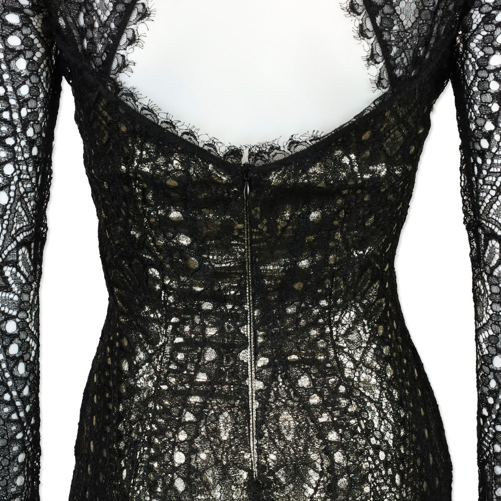 This Emilio Pucci dress is a high-octane statement of Italian glamour, expertly blending seductive silhouettes with opulent textures. The design features an exquisite black lace top layer that reveals a shimmering metallic gold underlay, creating a liquid-metal effect that catches the light with every movement. With a dramatic plunging neckline and a daring open back, this dress is balanced by elegant long lace sleeves and a sophisticated midi length.