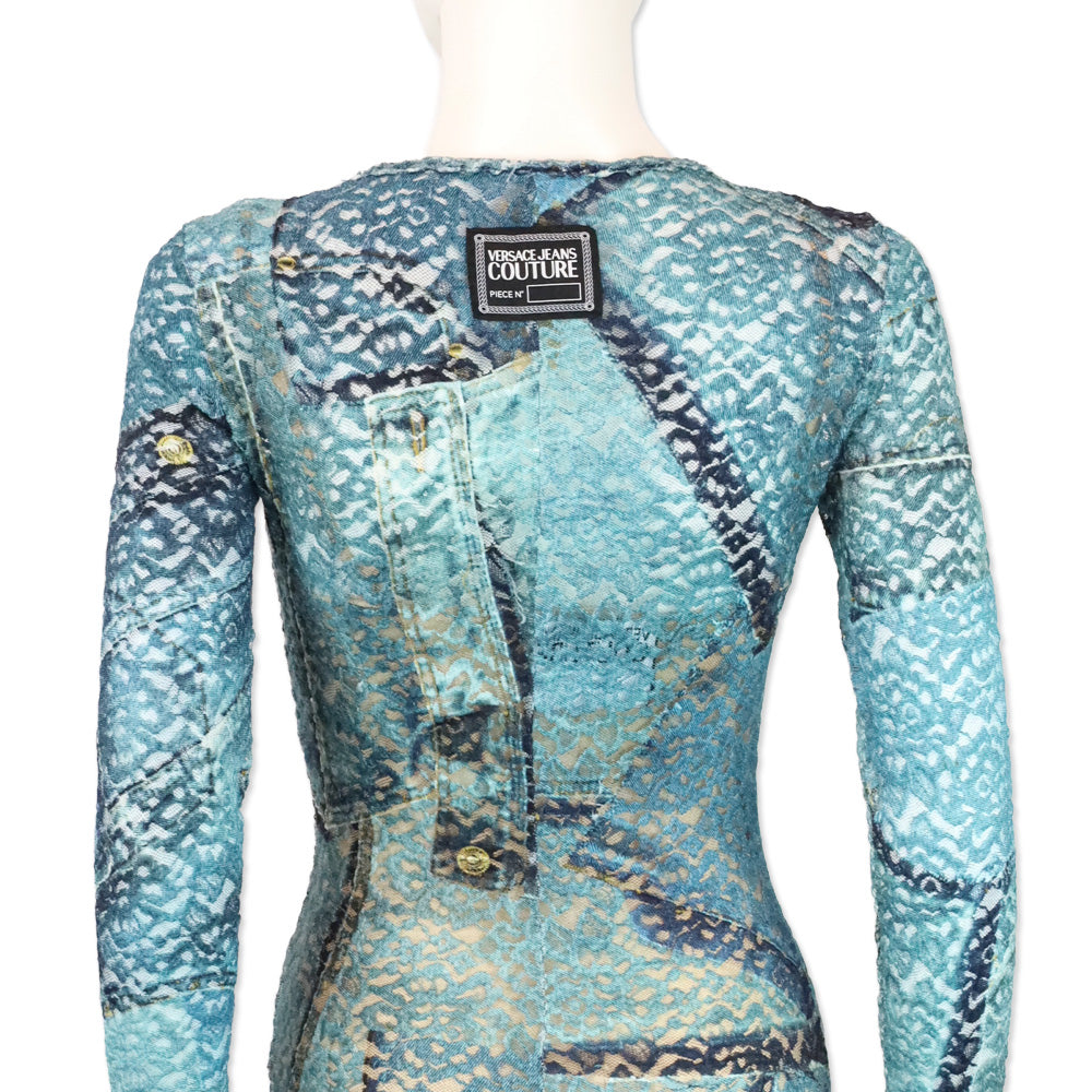 This Versace Jeans Couture "Bonnie" dress is a masterful display of high-fashion trompe-l'oeil, blending the edgy aesthetic of patchwork denim with the delicate, provocative nature of sheer lace. Crafted from a high-stretch nylon lace, the fabric features a hyper-realistic denim print that creates an intricate patchwork illusion. The bodycon silhouette is complemented by long sleeves and a classic crewneck, while a signature logo patch at the back collar cements its designer pedigree.
