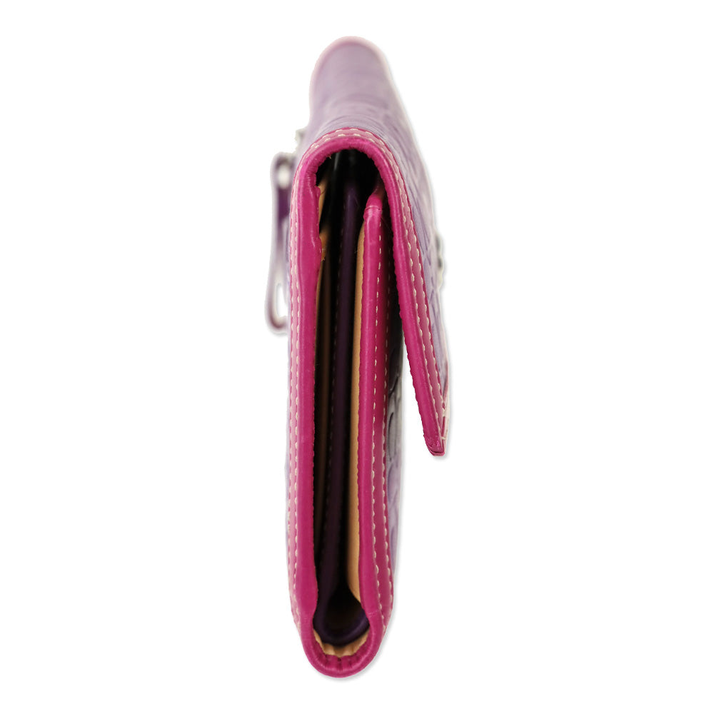 The Coach Purple Leather Signature Monogram Embossed Colorblock Trifold Checkbook Wallet brings refined elegance to everyday essentials. Crafted from purple embossed leather with fuchsia trim and a beige interior, this piece perfectly balances function and luxury.