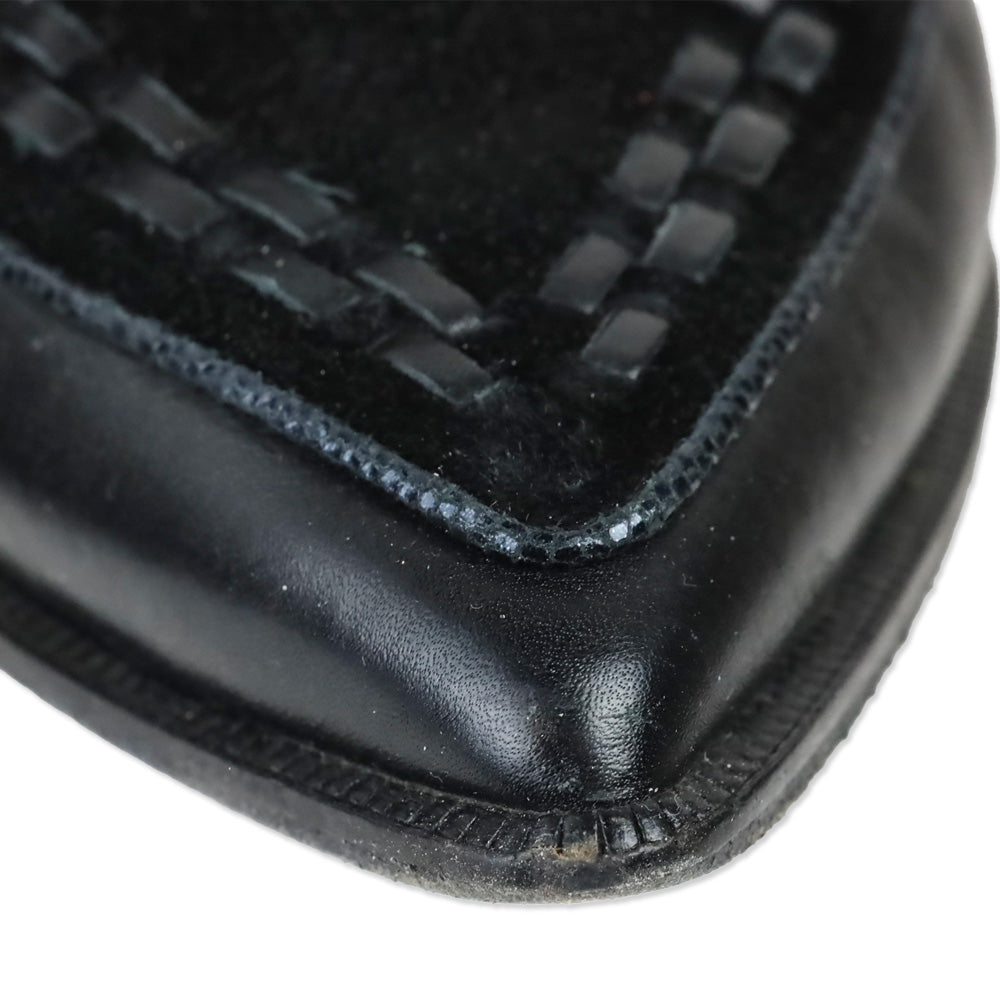 • Features: Pointed toe, three crossover buckle straps, contrasting stitching, silver-tone hardware