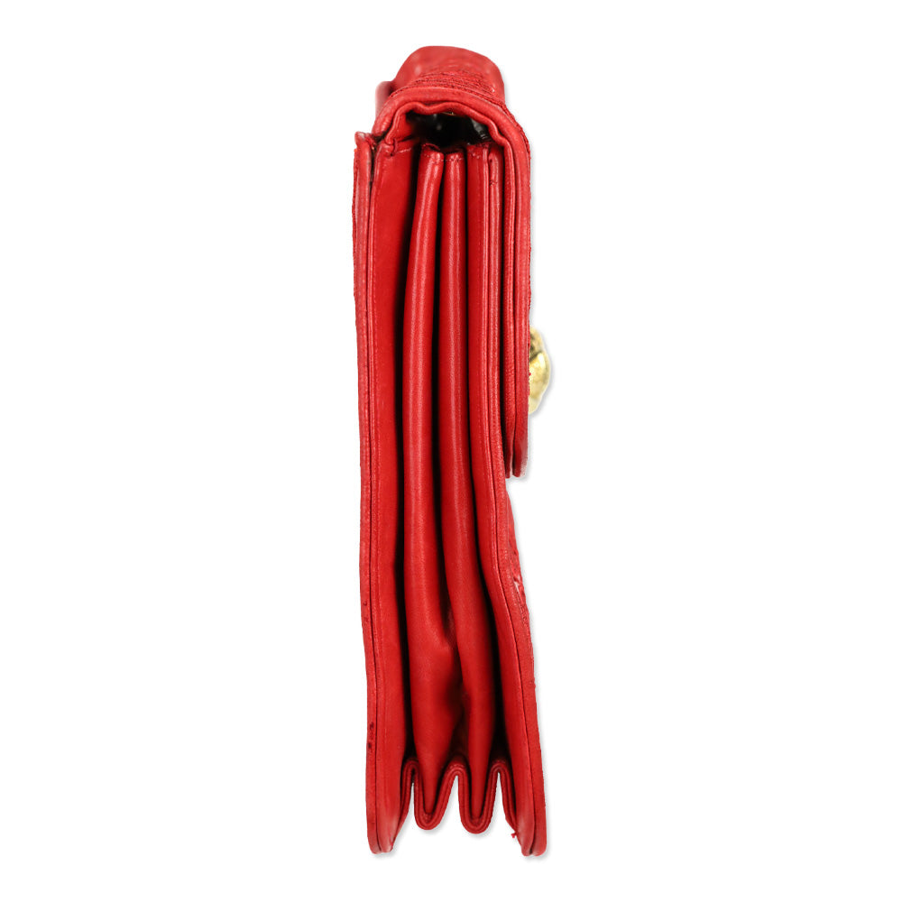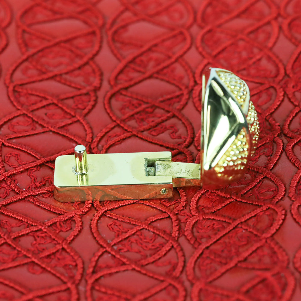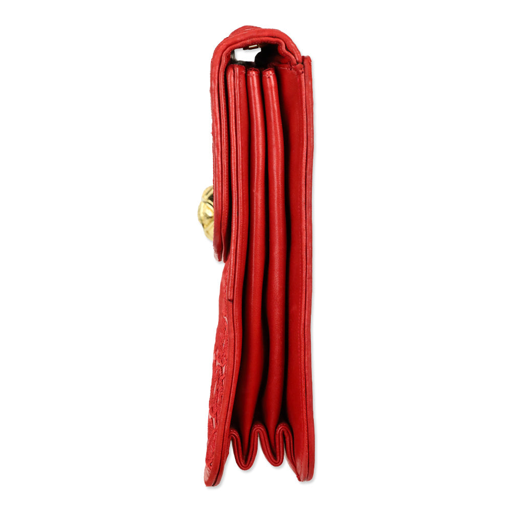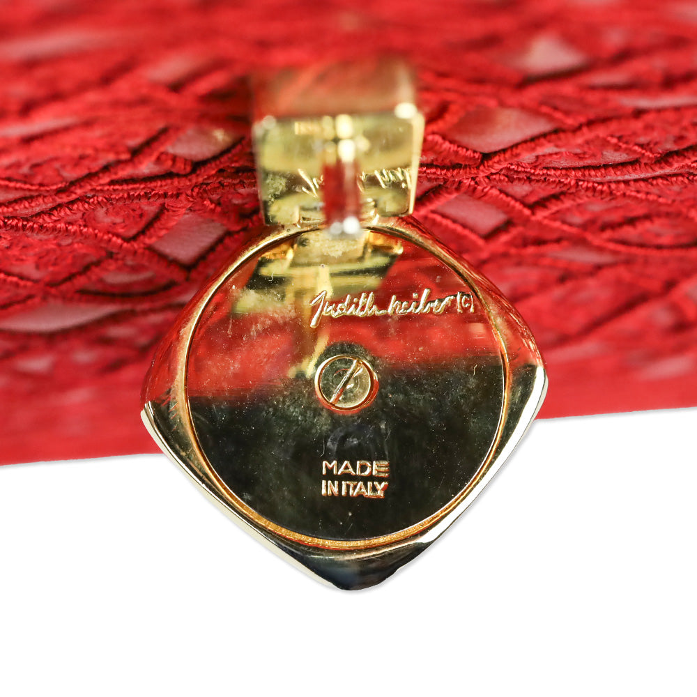 The Judith Leiber Red Crosshatch Embroidered Leather Square Clutch is a statement piece of timeless craftsmanship. Featuring intricate embroidered detailing on rich red leather, this structured clutch is finished with gold-tone hardware and a flap pin-lock closure for a refined, vintage-inspired look.