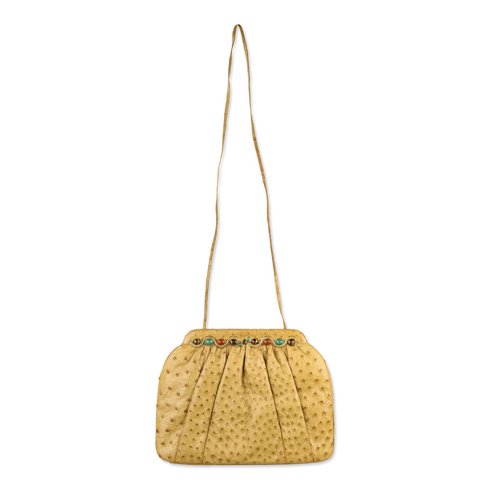 Judith Leiber Tan Ostrich Leather Stone Trim Frame Clutch