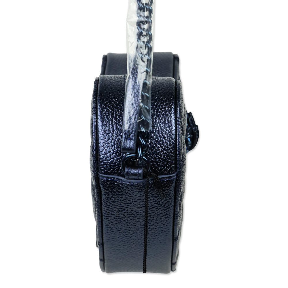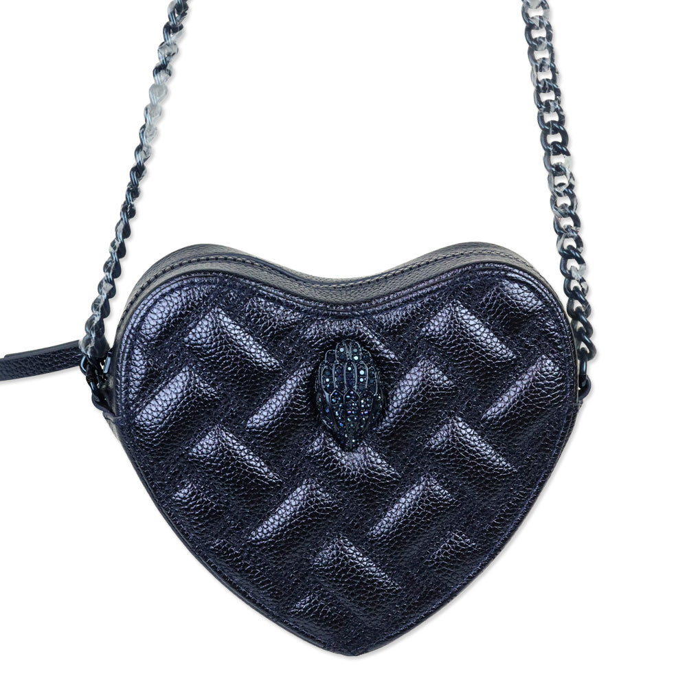 The Kurt Geiger London Dark Blue Quilted Leather Kensington Heart Crossbody Bag blends romantic heart-shaped design with edgy crystal-encrusted eagle hardware for a statement-making accessory. The geo-quilted leather and 22.75" chain strap create a versatile piece that transitions effortlessly from day to evening with distinctive London flair.
