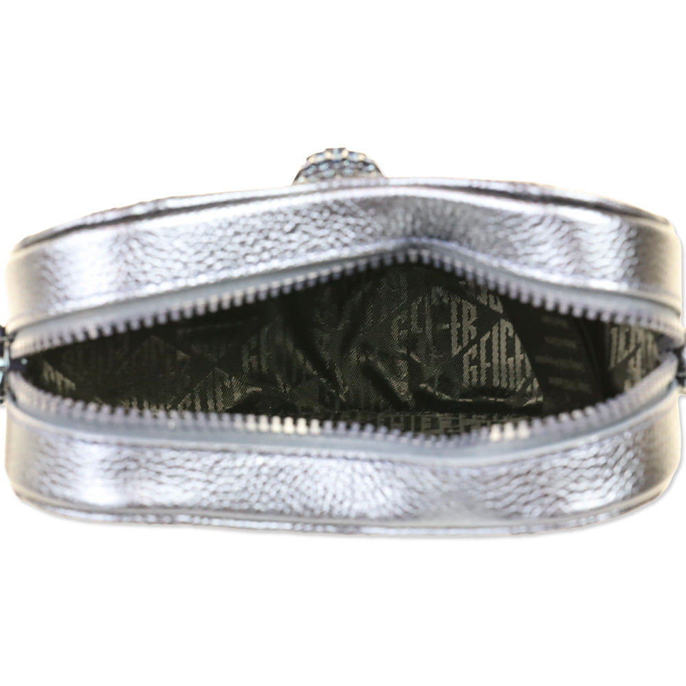 • Details: crystal-encrusted eagle head, heart shape, top zip closure, interior wall pocket