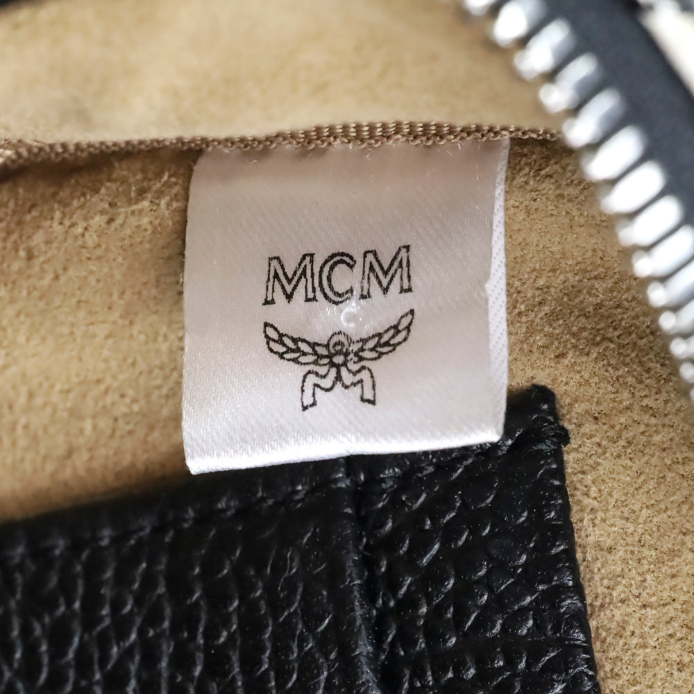 - Features: Leather top handle, detachable convertible shoulder straps, front zip compartment, side pockets with studded embellishments, interior card slots, zip closure, MCM logo plate