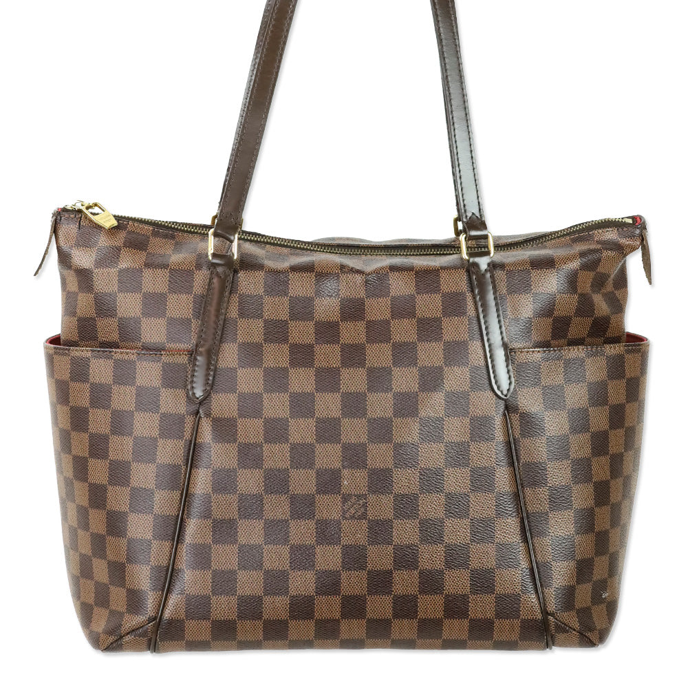 This authentic Louis Vuitton Damier Ebene Coated Canvas Totally MM Bag is a stylish and versatile tote, perfect for daily use. Crafted from the iconic Damier coated canvas in brown, it features elegant brown glossy leather trim and gold-tone hardware. The bag offers excellent organization with a top zipper closure, two handy exterior side pockets, and a spacious red fabric interior that includes three flat pockets and a D-ring.
