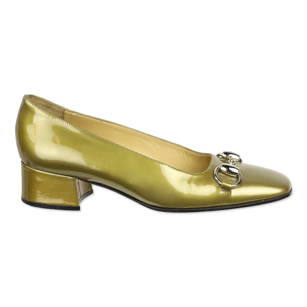 Gucci Gold Patent Leather Horsebit Square Toe Pumps