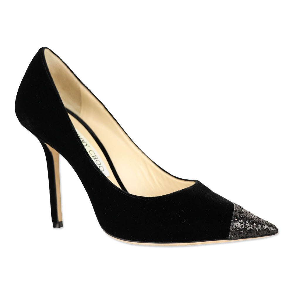 Jimmy Choo Love 100 pumps, black velvet glitter heels, pointed toe pumps, size 38 designer shoes, 4 inch stiletto heel, New Year's Eve shoes, excellent condition Jimmy Choo Glamorous evening footwear, luxurious material contrast, confident silhouette, versatile occasion wear, signature brand style, glitter sparkle statement, high-end party shoes