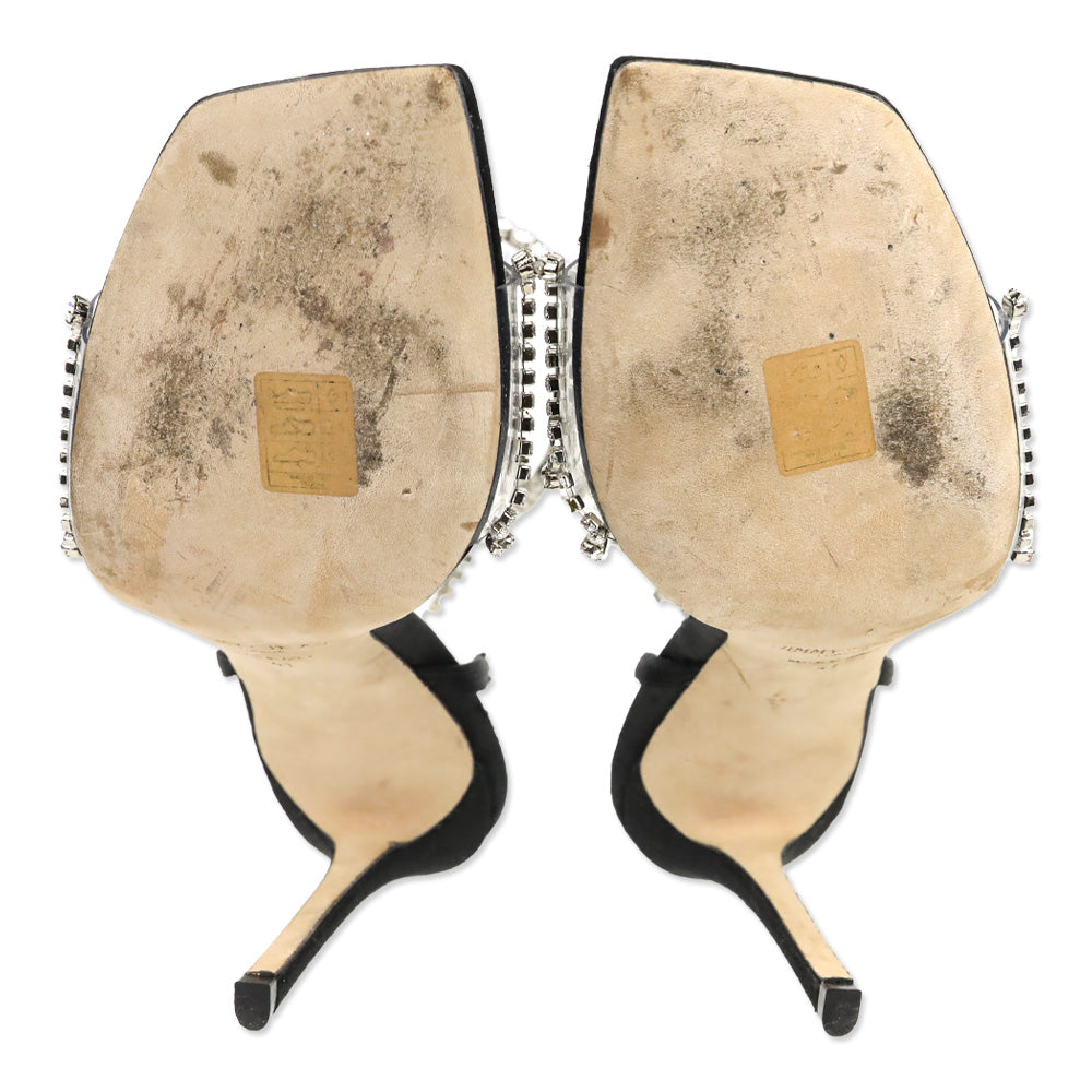 The Jimmy Choo Black Satin Crystal-Embellished Ankle-Strap Sandal is a glamorous and statement-making heel that will elevate any outfit. Crafted with a sleek PVC upper and a satin insole, this sandal features an eye-catching, crystal-encrusted chainlink ankle strap and a substantial 5" heel.