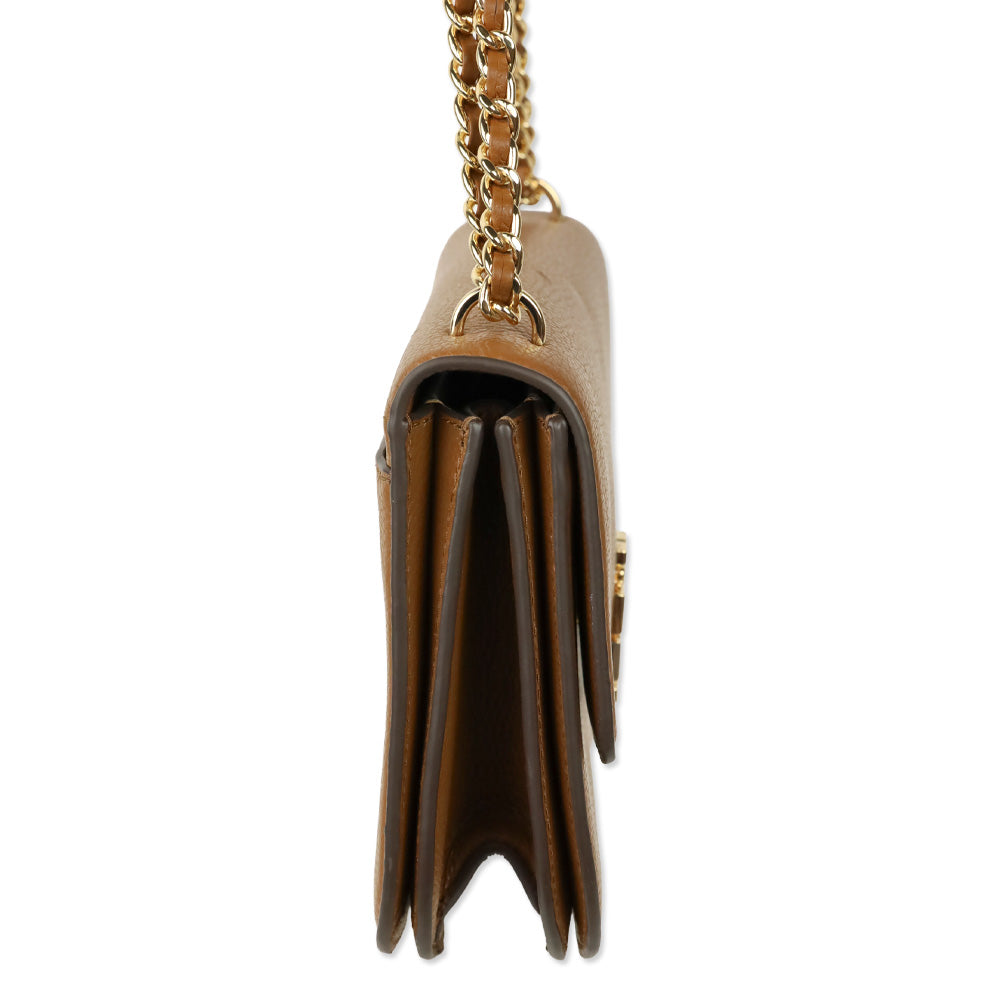 The Tory Burch Tiramisu Britten Small Adjustable Shoulder Bag is a sophisticated and versatile accessory crafted from genuine pebbled leather. Its adjustable chain strap allows for multiple ways to wear, including as a shoulder bag, crossbody, or carried as a clutch. The design features a solid shade with the signature logo emblem on the main flap, making it a compact yet luxurious addition perfect for everyday elegance.