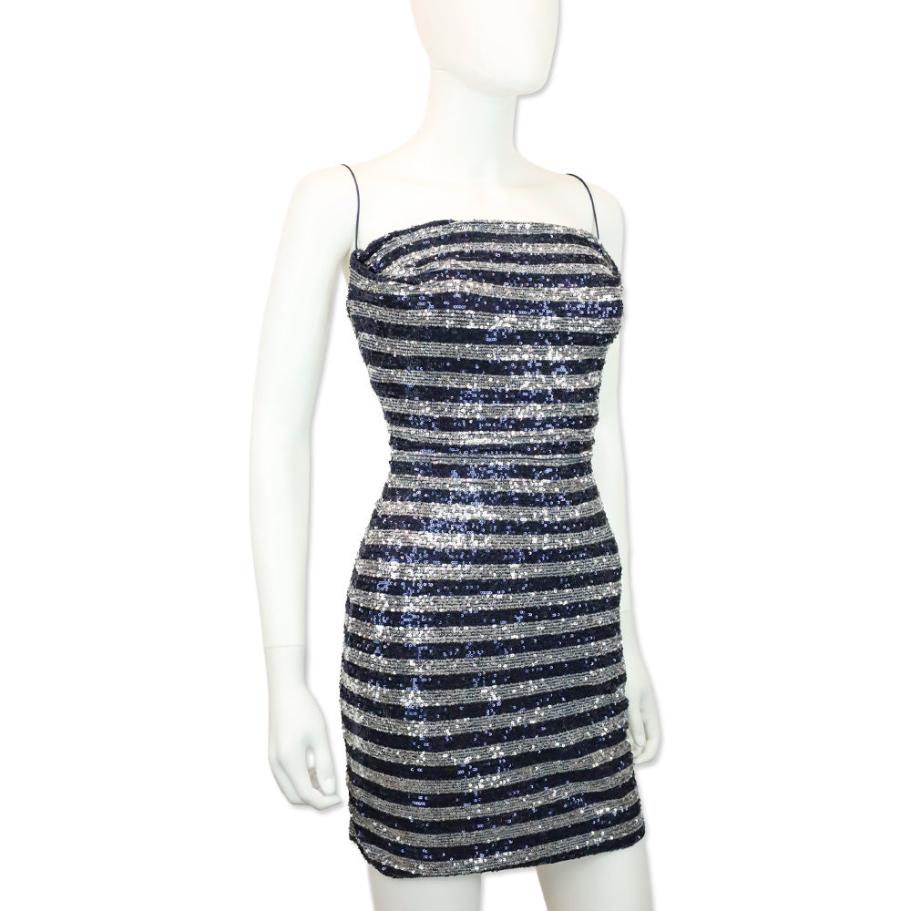 Balmain Navy/Silver Striped Sequined Spaghetti Strap Mini Dress