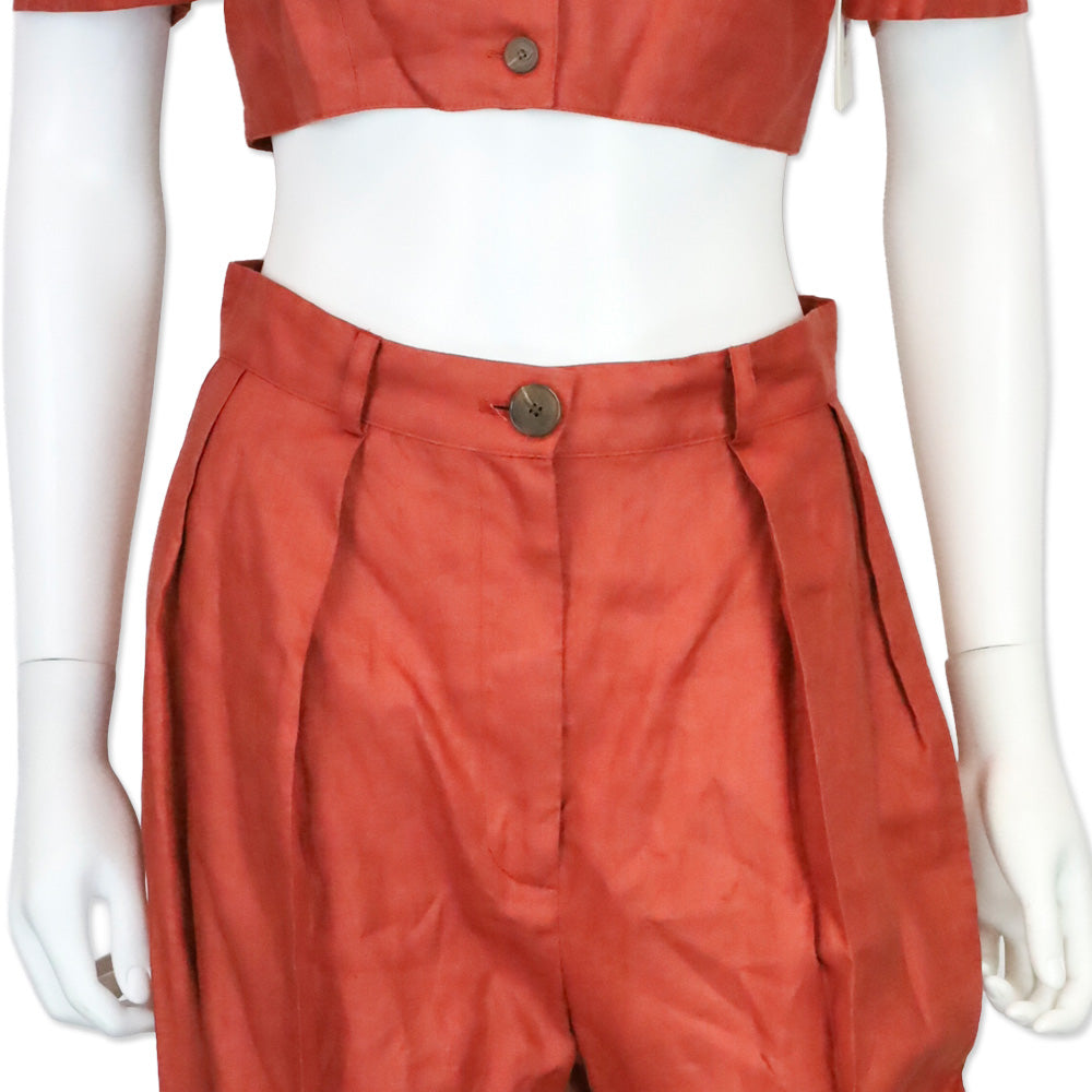 Matthew Bruch Terracotta Linen Button Pleated High-Waisted Wide-leg Trouser Pants