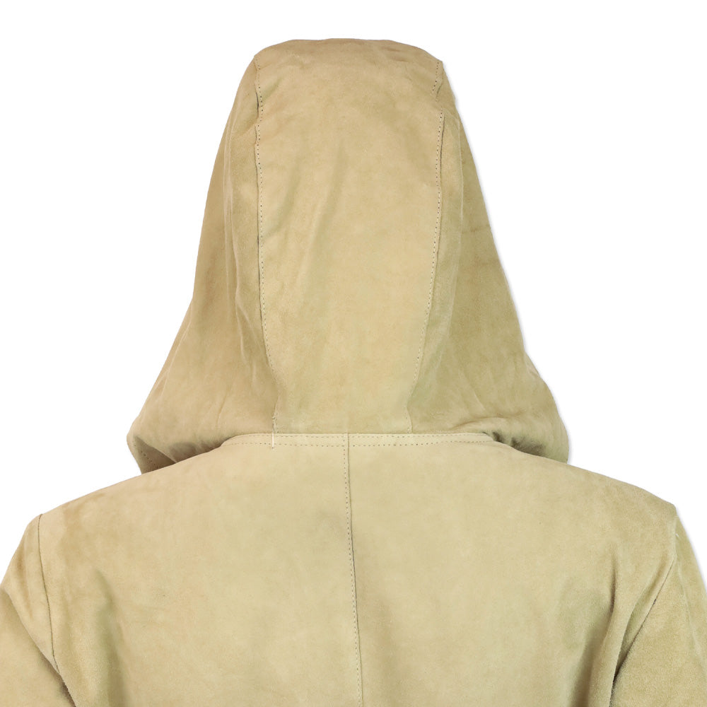 This 'S Max Mara coat is the epitome of luxurious understated style, offering a sophisticated take on the classic hooded wrap coat. Crafted from premium genuine tan suede, this piece features a velvety-soft exterior and a contrasting dark brown unlined interior, showcasing the exceptional quality of the leather. The silhouette is defined by a generous hood and a matching suede belt that cinches the waist for a flattering, tailored fit.