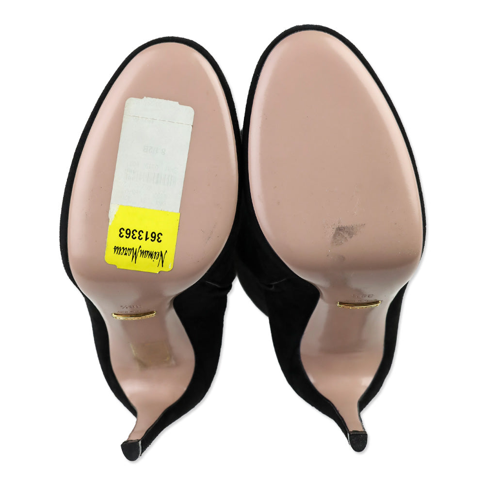 These Gucci Knee-High Boots are a masterclass in Italian glamour, offering a sleek and statuesque silhouette that defines luxury footwear. Crafted from velvet-soft black suede, these boots feature a rounded toe and a dramatic 4.75-inch heel, creating a bold, leg-lengthening effect. Reaching a classic 17-inch height, the shaft is designed to sit perfectly at the knee, while the side zip closure ensures a seamless, tailored fit.