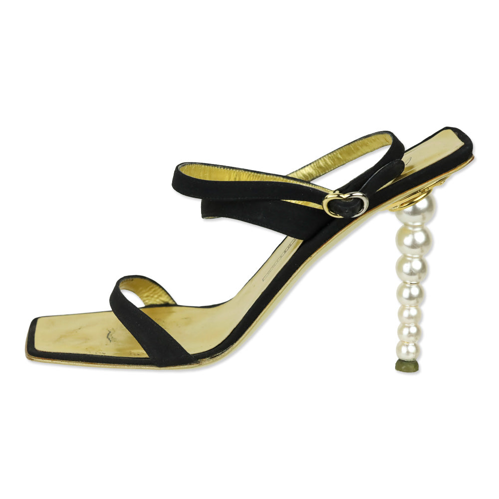 These Giuseppe Zanotti heels are a dramatic fusion of avant-garde architecture and classic evening glamour. Crafted from lustrous black satin, the silhouette features a modern square toe and a striking gold-colored insole that provides a rich, high-contrast glow. The true centerpiece is the 4.5-inch sculptural heel, which is elegantly encircled by a strand of pearls, creating a jewelry-like effect with every step.