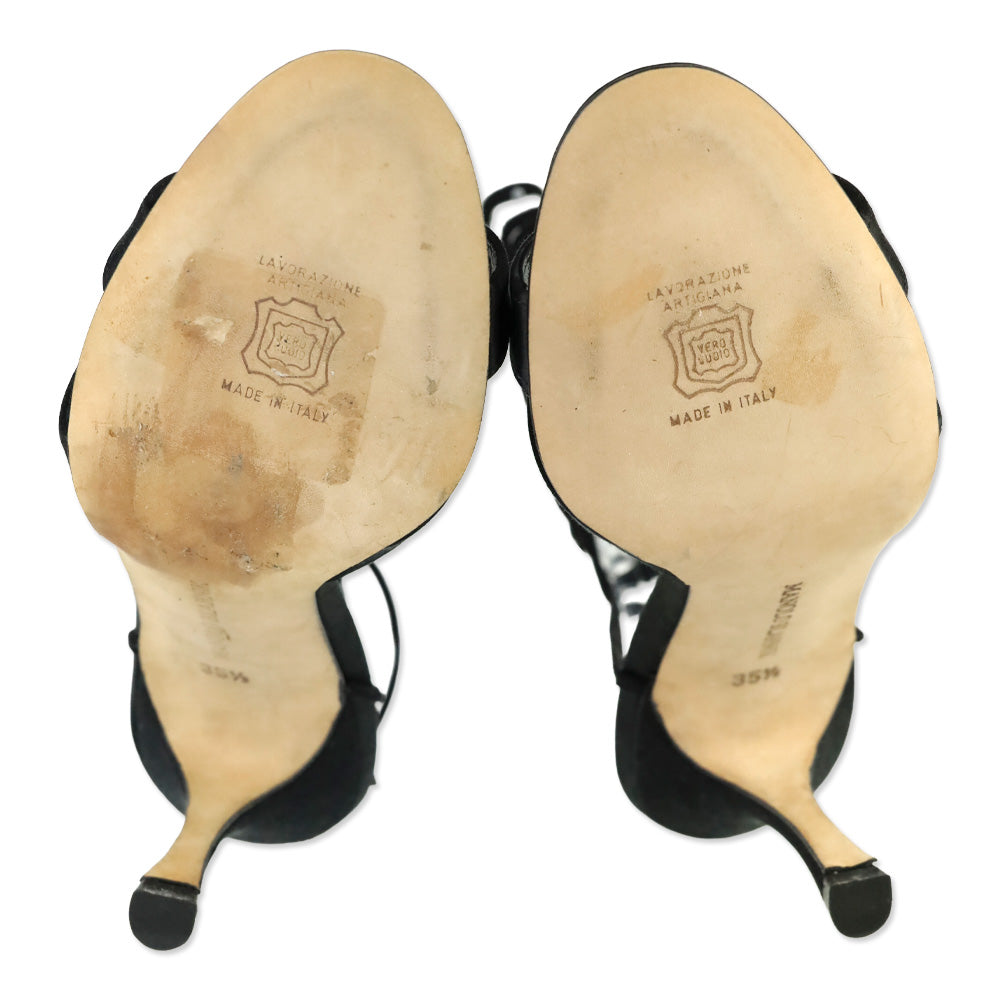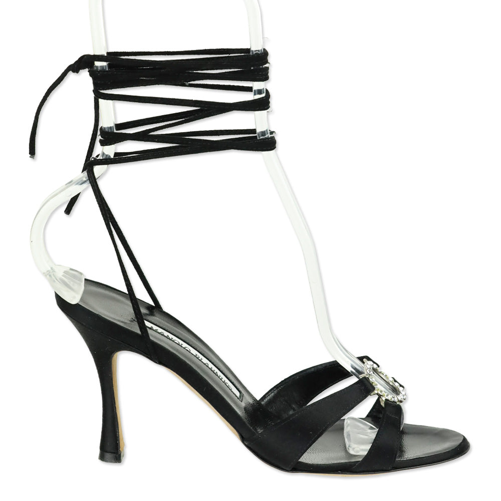 Manolo Blahnik Black Satin Round Crystal Ankle-Wrap Sandal