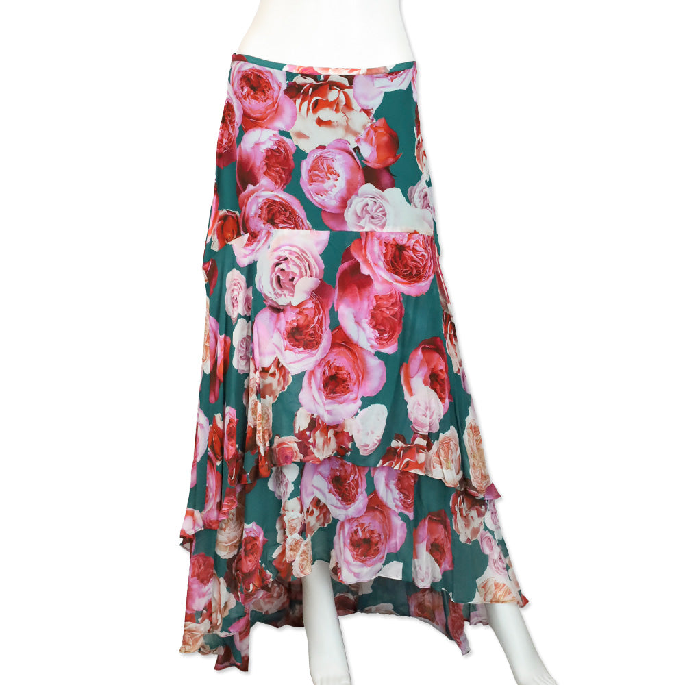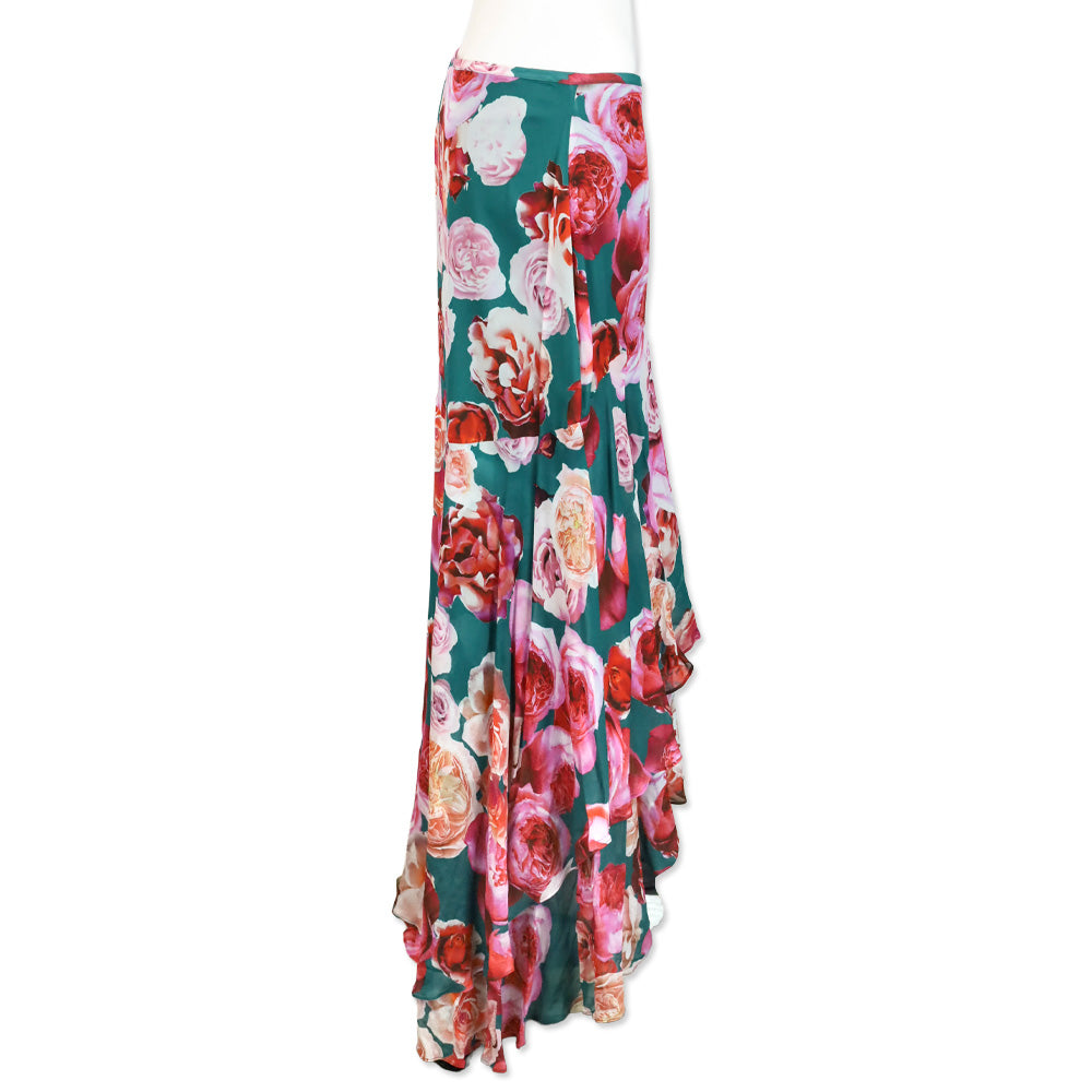 - Details: Tiered high-low silhouette; side zipper closure; fully lined; dark teal background with vibrant rose floral motif.