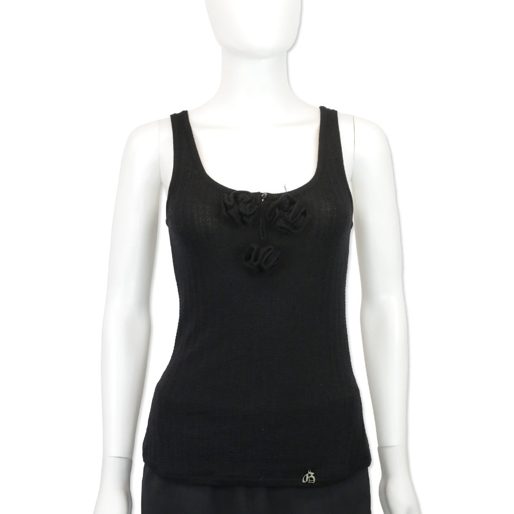 John Galliano Black Wool Blend Ribbed Knit Tank Top with Floral Accent