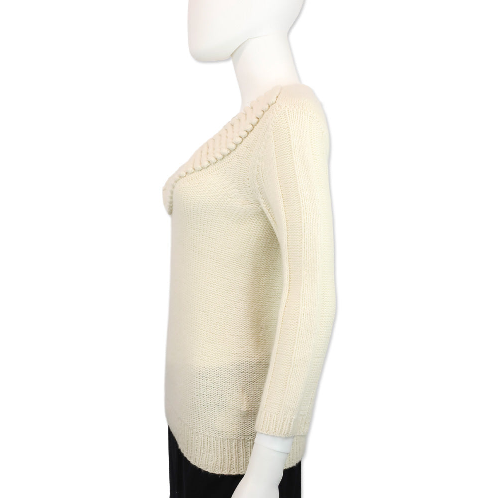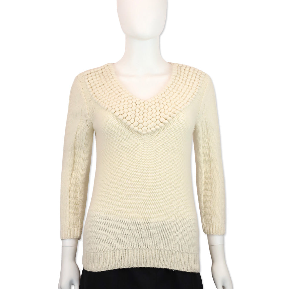 TSE Cream Cashmere Knit Pom Pom V-Neck Sweater
