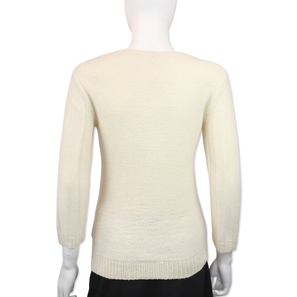 This TSE knit sweater is crafted from luxurious 100% cashmere in a versatile cream hue. The design features a flattering V-neckline uniquely accented with a playful pom-pom trim along the front. With its ribbed 3/4-length sleeves and soft knit texture, this piece offers a sophisticated yet whimsical addition to a classic wardrobe.