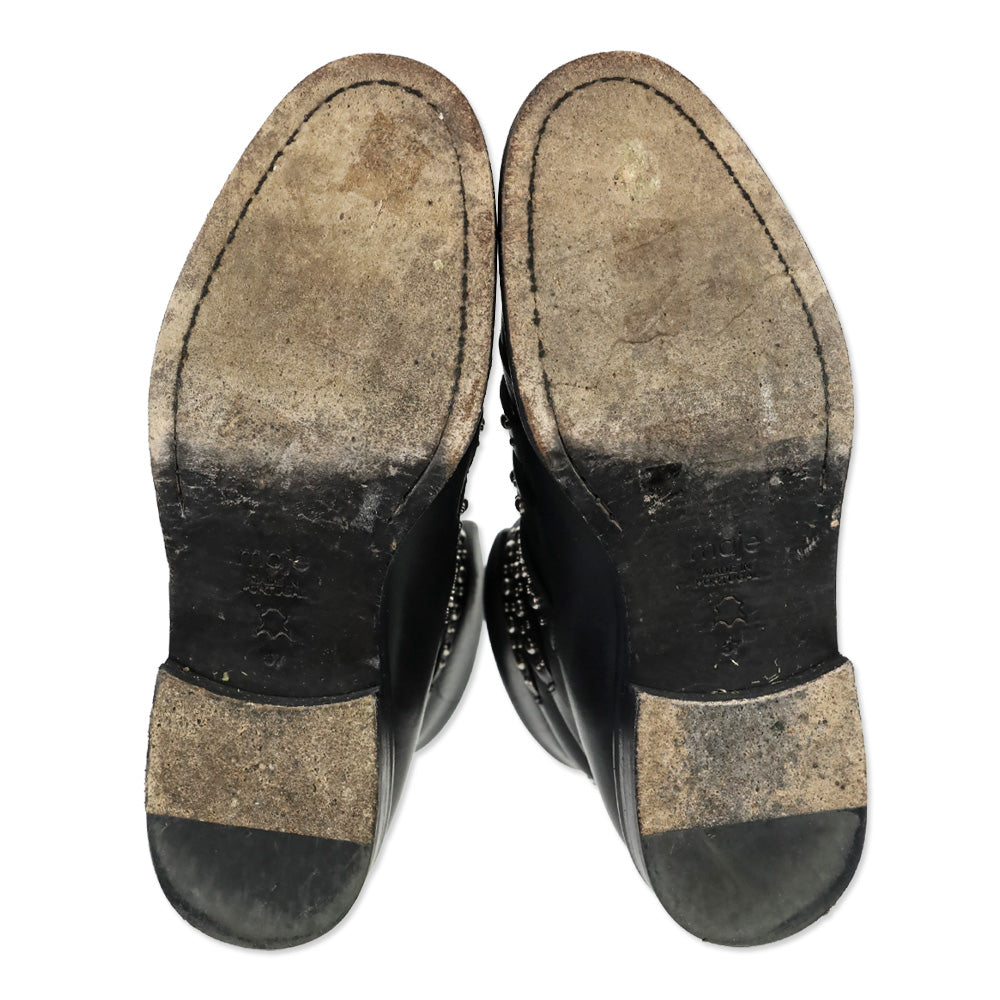 The Maje Fortune Black Leather Studded Buckle Boots are stylish ankle boots crafted from black leather. They feature a rugged design with multiple studded accents, an almond-shaped toe, and a stacked heel. The boots are detailed with five buckled straps across the uppers and include pull tabs for easy wear. They are finished with an adjustable buckle fastening and a durable rubber sole.