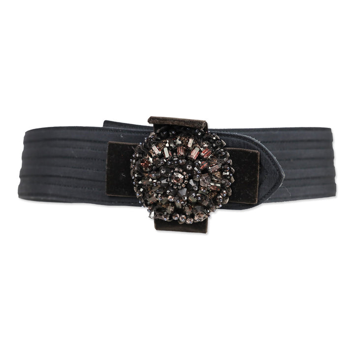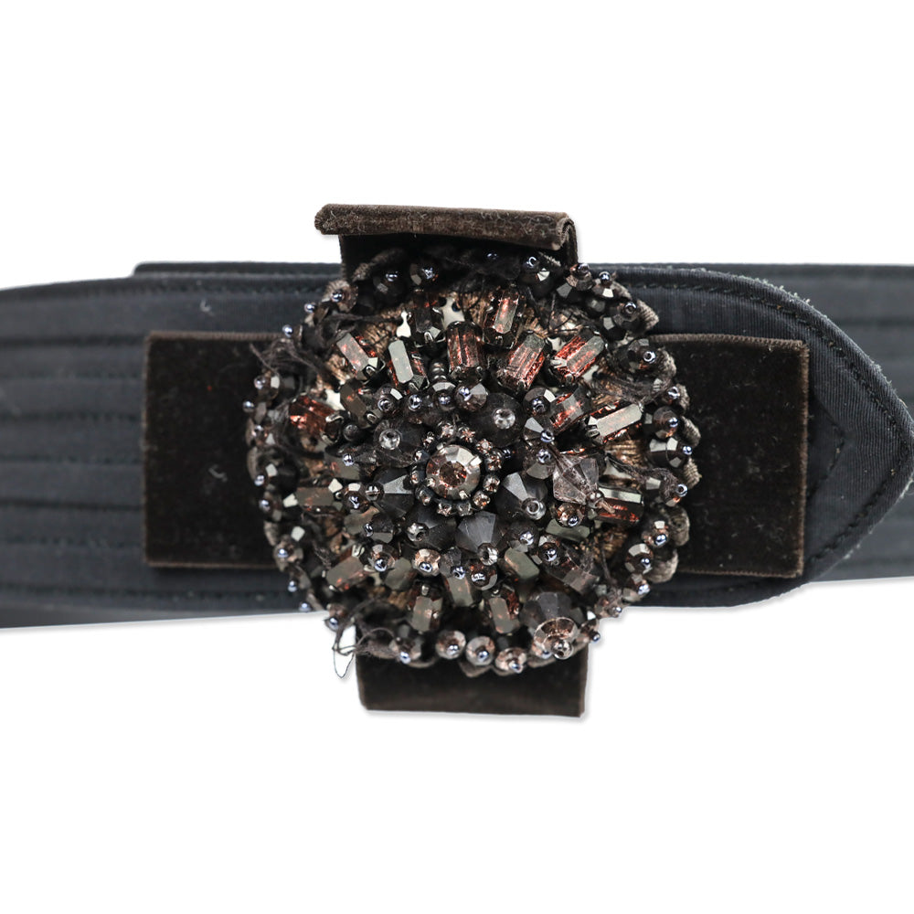Carolina Herrera Black Ribbed Grosgrain Belt with Brown Beaded Floral Appliqué