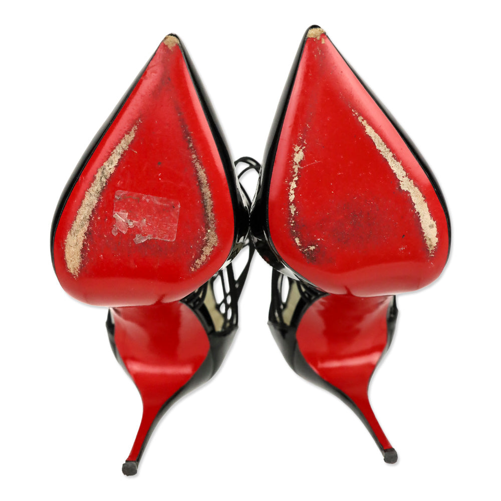 • Design Features: Delicate intertwining patent straps, black-tone hardware, and the iconic Louboutin red sole