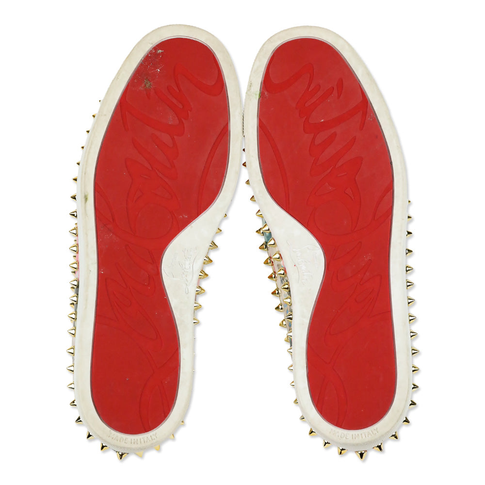 The Christian Louboutin "Pik Boat" sneakers are a rebellious take on the classic slip-on silhouette, featuring the house's avant-garde "Trash" print on high-shine patent leather. This Italian-made platform sneaker is framed by signature gold-toned spiked studs and finished with the iconic red rubber logo outsole, blending street-style comfort with high-fashion edge.