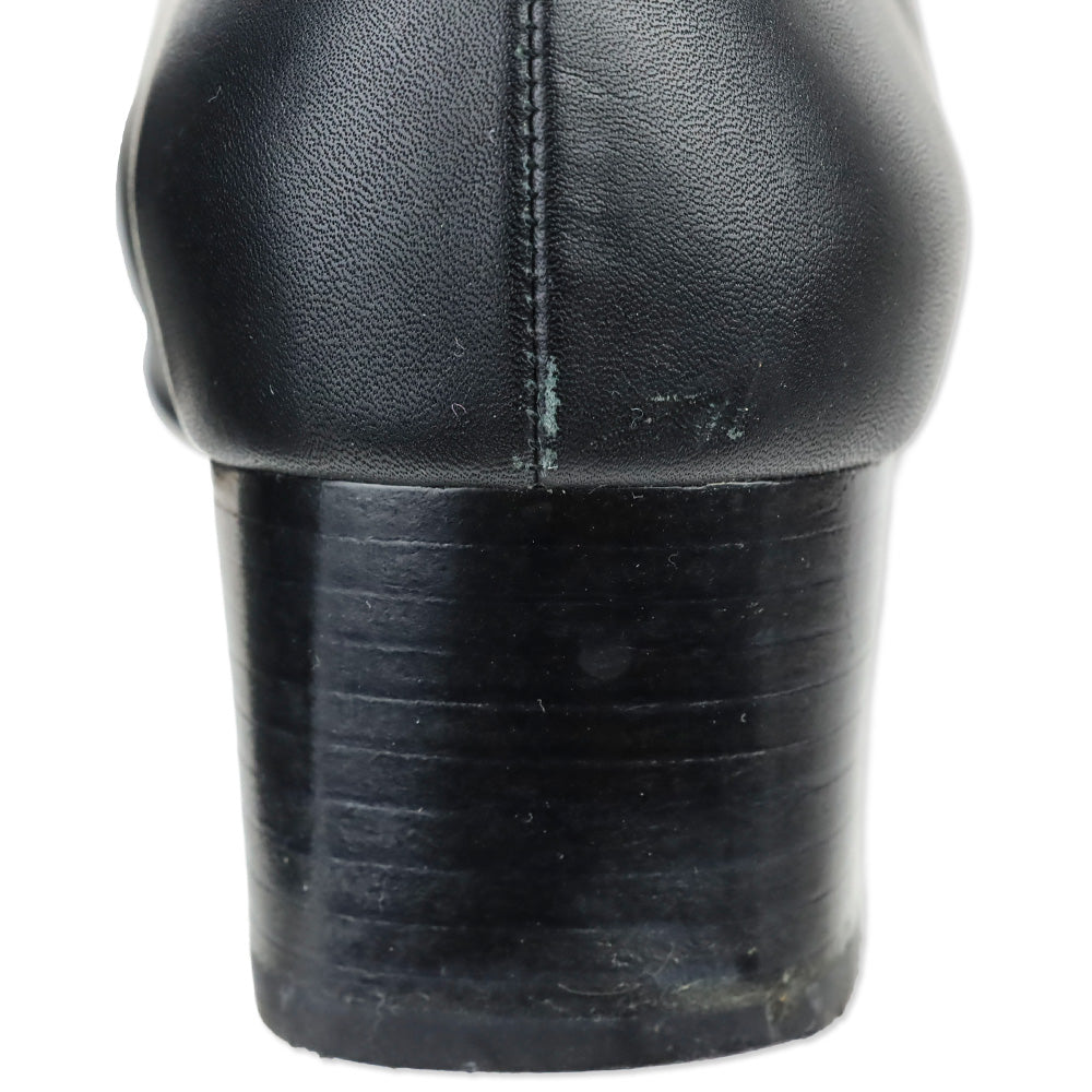 The Salvatore Ferragamo Black Calf Leather Gancini Accent Pump is a classic style featuring a squared toe and a comfortable block heel. Crafted entirely from leather, these pumps are accented with a thick Gancini buckle in gunmetal hardware, offering a signature sophisticated touch.