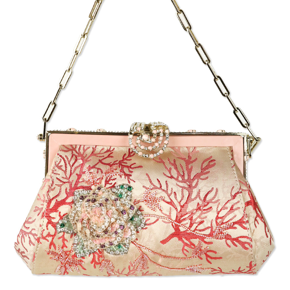 • Features: Beaded and hand-painted coral motif, single open interior compartment, double chain handles