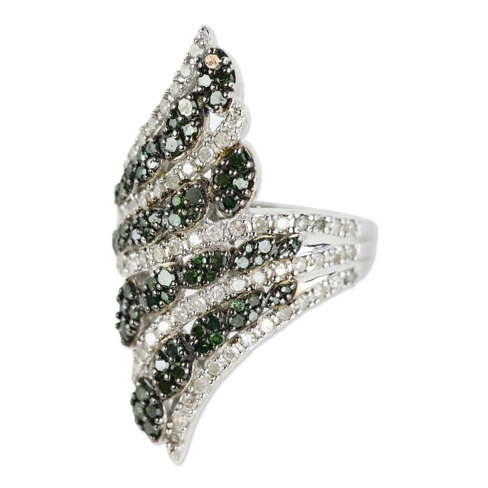 The D'Joy Green and White Diamond Bypass Ring in Platinum Over Sterling Silver is a striking piece that transforms everyday elegance into extraordinary allure. This elongated, dual-row bypass ring showcases an artful cluster of green and colorless diamonds, creating an irresistible sparkle and a modern, artistic design.