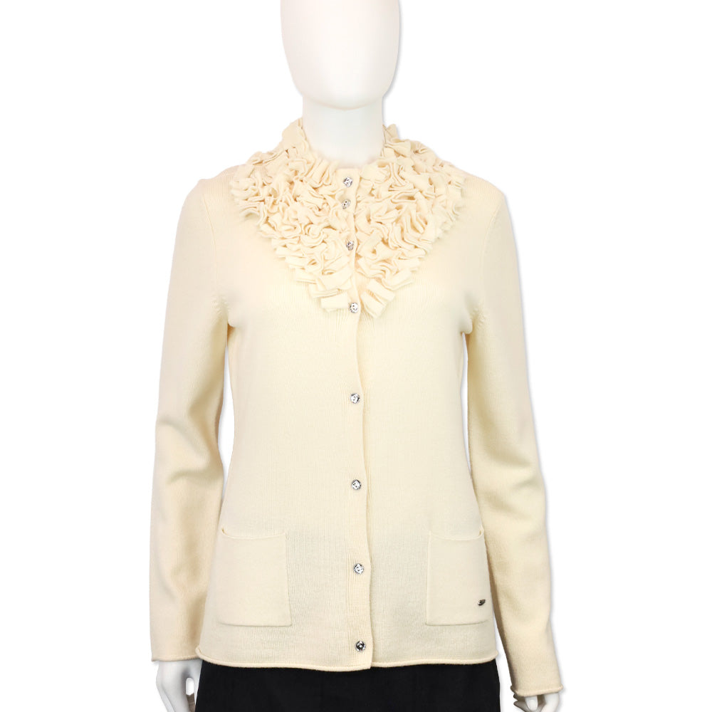 Escada Off-White Wool Knit Ruffle Neck Crystal Button Cardigan