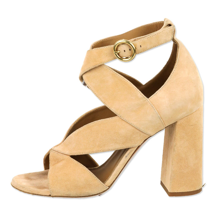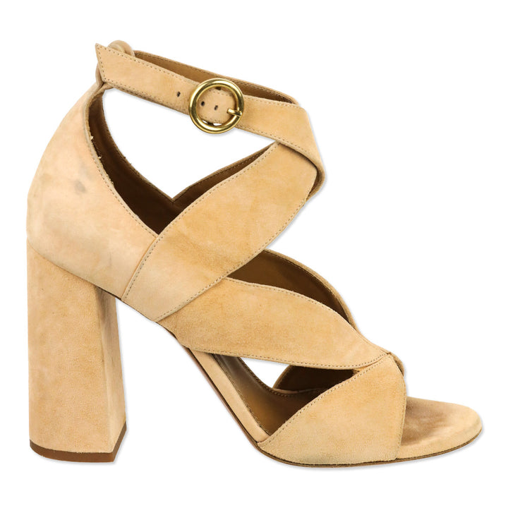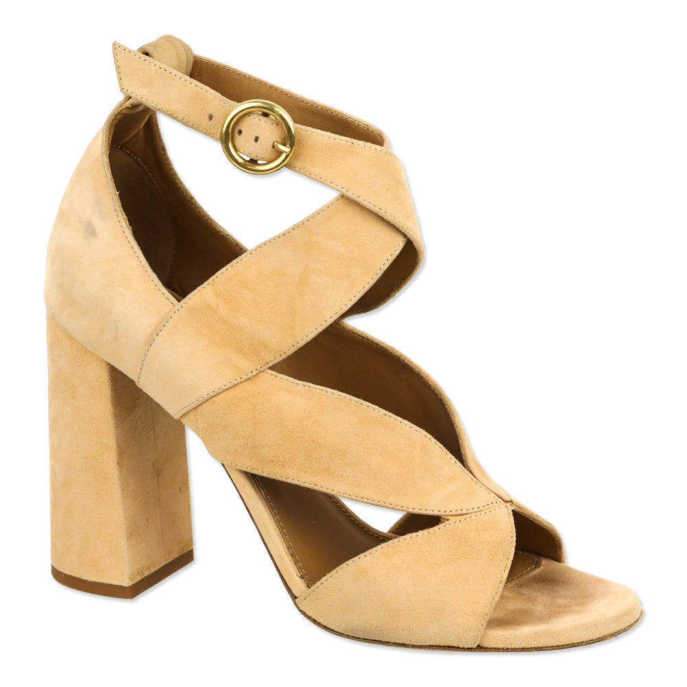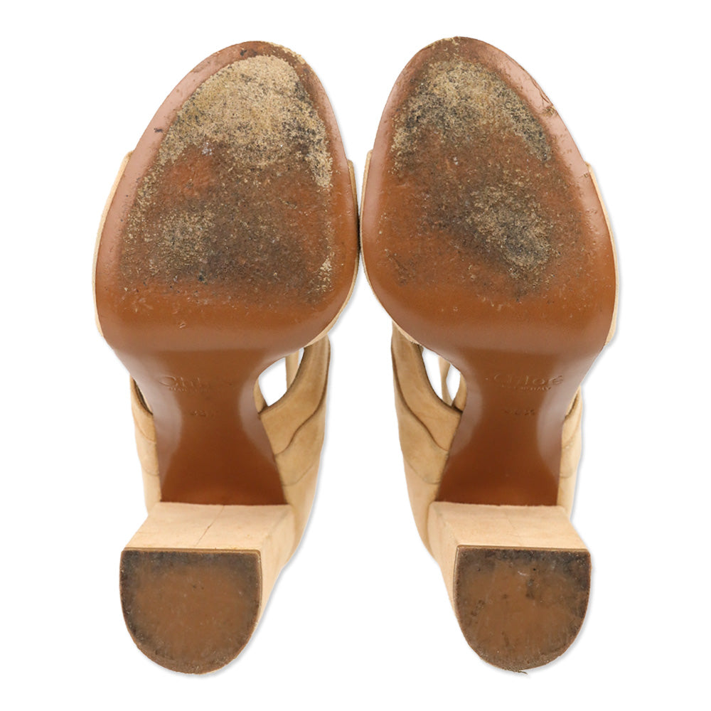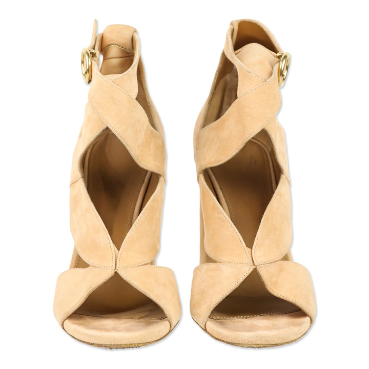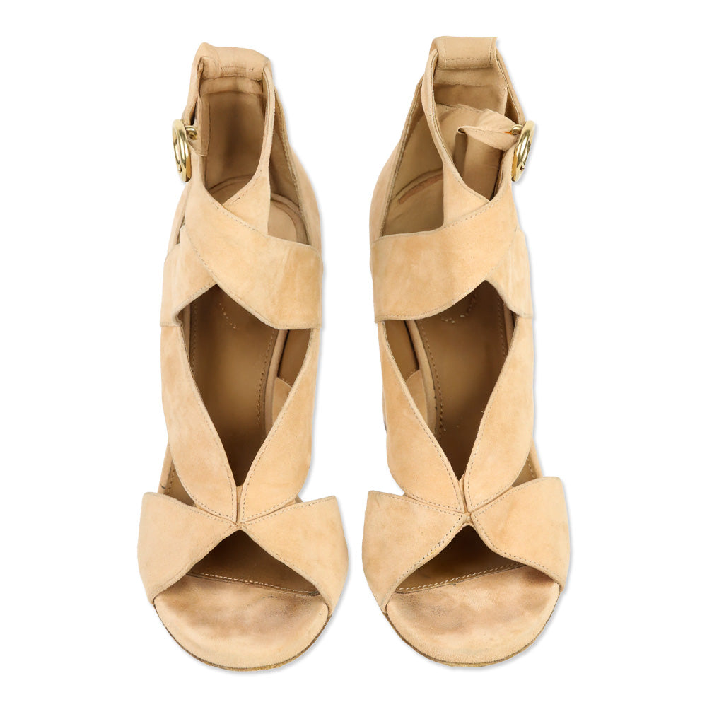 Chloé peach suede sandals, graphic leaves sandal, size 38.5 designer heels, open toe block heel, 70s inspired sandals, excellent condition Chloé Parisian-boho fusion, botanical romanticism, crushed velvet texture, 70s nostalgia revival, side-buckle functionality, Chloé femininity codes, peach-suede warmth