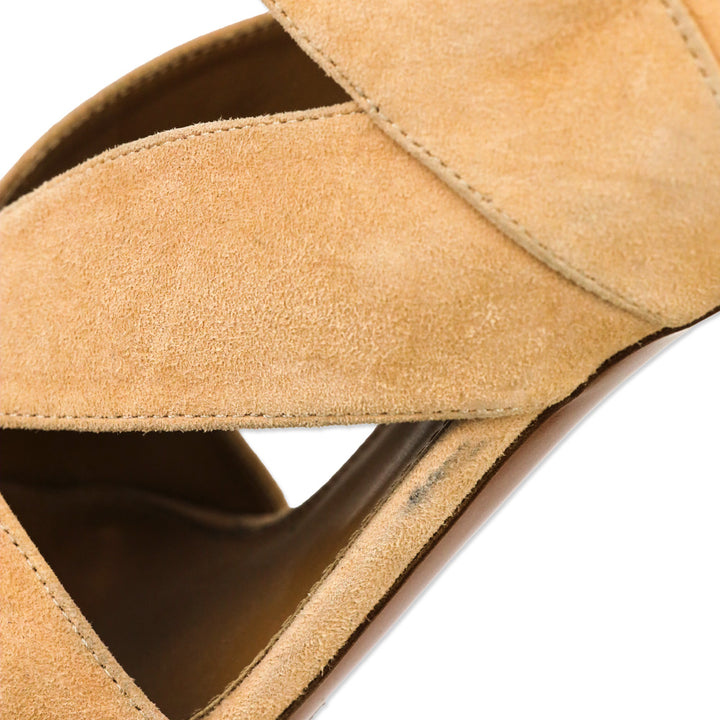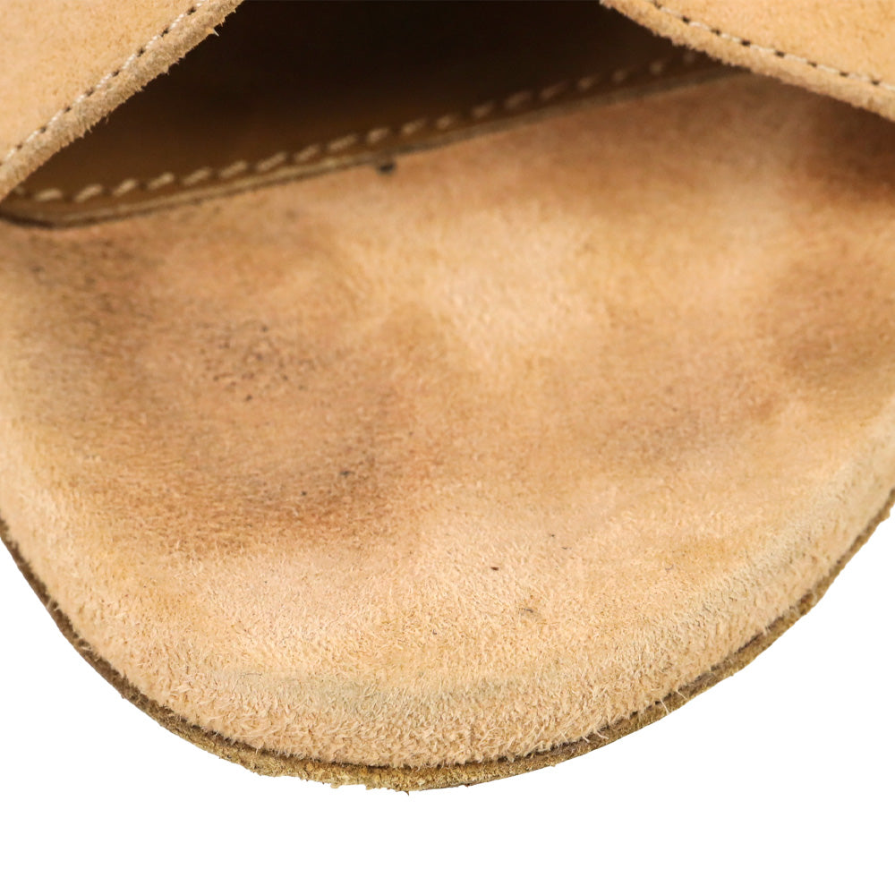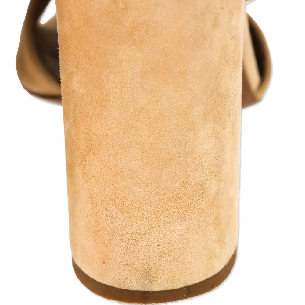 The Chloé Peach Suede Graphic Leaves Sandal embodies 1970s Parisian romance with its open-toe silhouette and botanical-inspired detailing. Crafted from peach suede with a high block heel and side buckle fastening, this size 38.5 sandal merges nostalgic femininity with modern elegance - a quintessential Chloé statement piece.