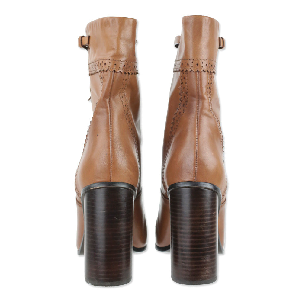 Tory Burch booties, Huxley tassel, brown leather, women's size 9.5, designer shoes, luxury footwear, ankle boots, leather booties, classic style, timeless fashion, high-end apparel, sophisticated look, pre-owned luxury, fashion resale, authentic Tory Burch, American brand, elegant piece, chic shoes, versatile style, professional footwear, timeless design, luxury brand, luxury fashion, leather shoes, designer boots, polished look, sleek silhouette, comfortable heels, everyday wear, designer booties, tassel detail, stacked heel, fall fashion.