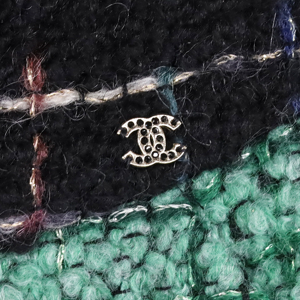 Chanel Green Tweed Midi Skirt showcases the brand's legendary craftsmanship with a luxurious wool-blend fabric and distinctive fringed hem detailing. The size FR 42 French-made piece features practical pockets and a contrast black waistband, offering sophisticated versatility for collectors and fashion enthusiasts alike.