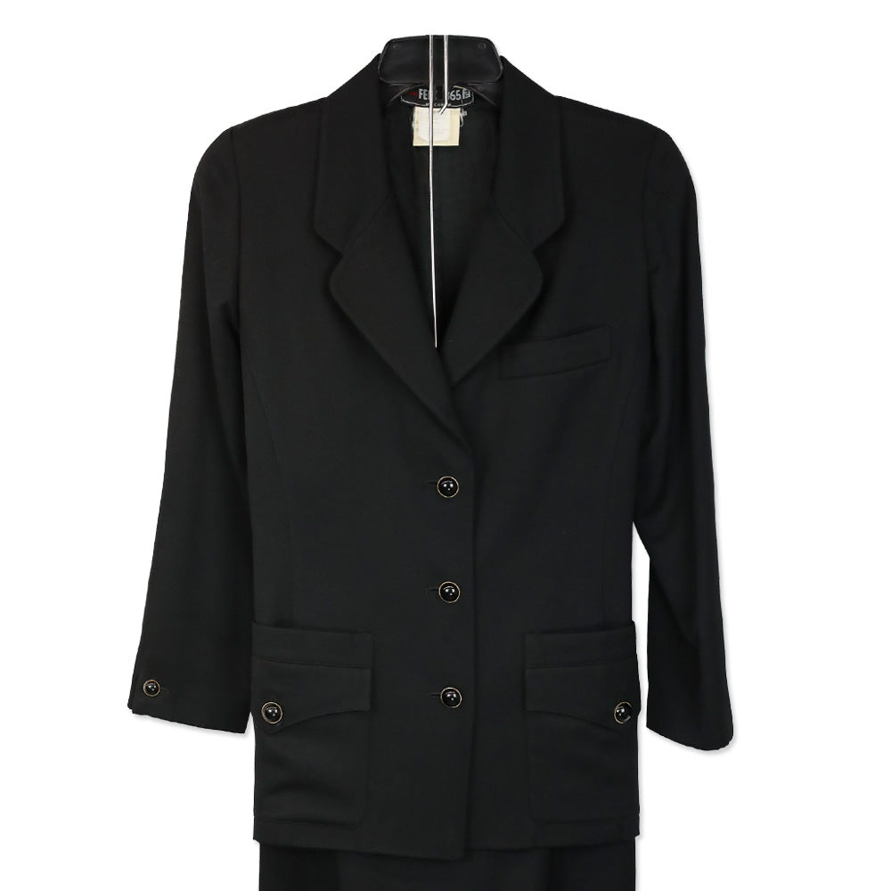Fendi 365 by Contri Black Jacket & Skirt Set, Fendi suit, vintage Fendi, 1980s collaboration, black jacket, black skirt, virgin wool, clover lapel, patch pockets, button flap pockets, domed buttons, gold sawtooth trim, single button cuffs, chest welt pocket, size 40, viscose lining, bemberg lining, pencil skirt, back zipper, back button closure, made in Italy, jacquard lining, polyamide lining, excellent condition, luxury set, designer set, authentic Fendi, preloved Fendi, women's suit, stylish suit