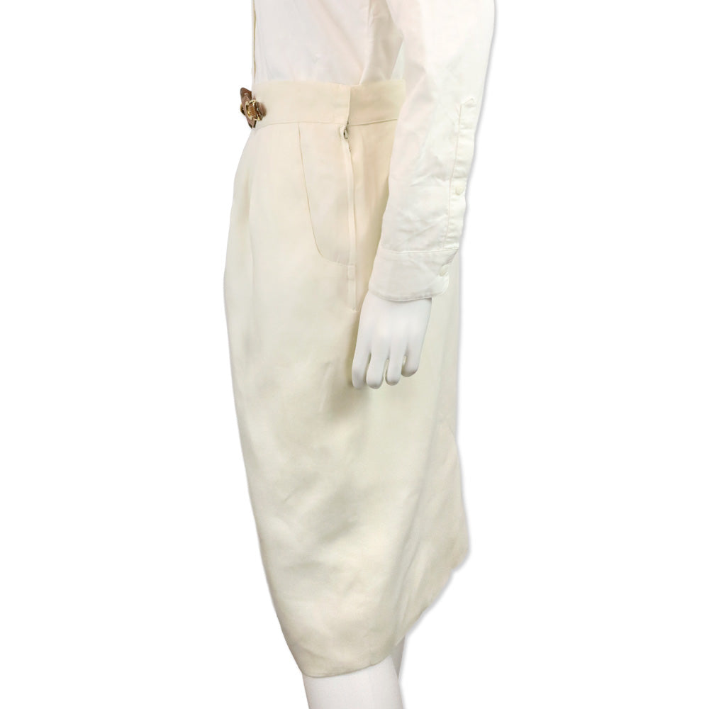 Hermès Cream Linen Midi Skirt with Gold Studded Leather Belt Accent