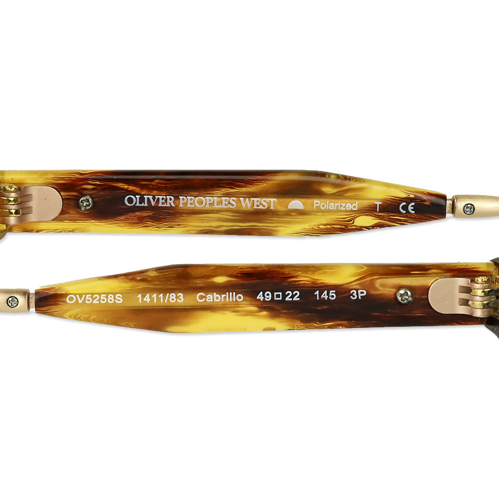 The Oliver Peoples West Cabrillo Wayfarer Tinted Sunglasses combine a classic square shape with a sophisticated mix of rose gold metal arms and a Havana gold plastic frame. Brown polarized lenses complete the look, offering both style and sun protection.