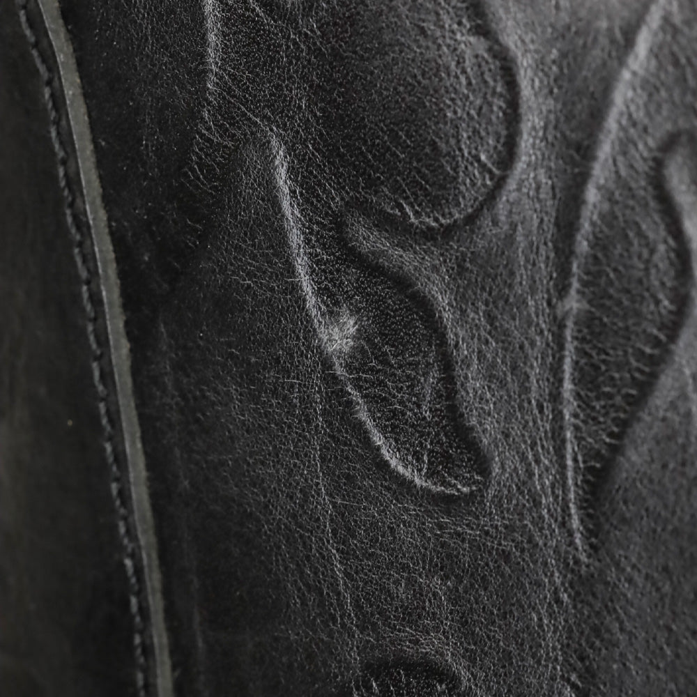This stylish Christopher Kon Black Embossed Leather Tote is a modern accessory featuring a striking embossed texture. The bag secures with a snap magnetic button closure and features a decorative tassel accented with red cylinder stones.