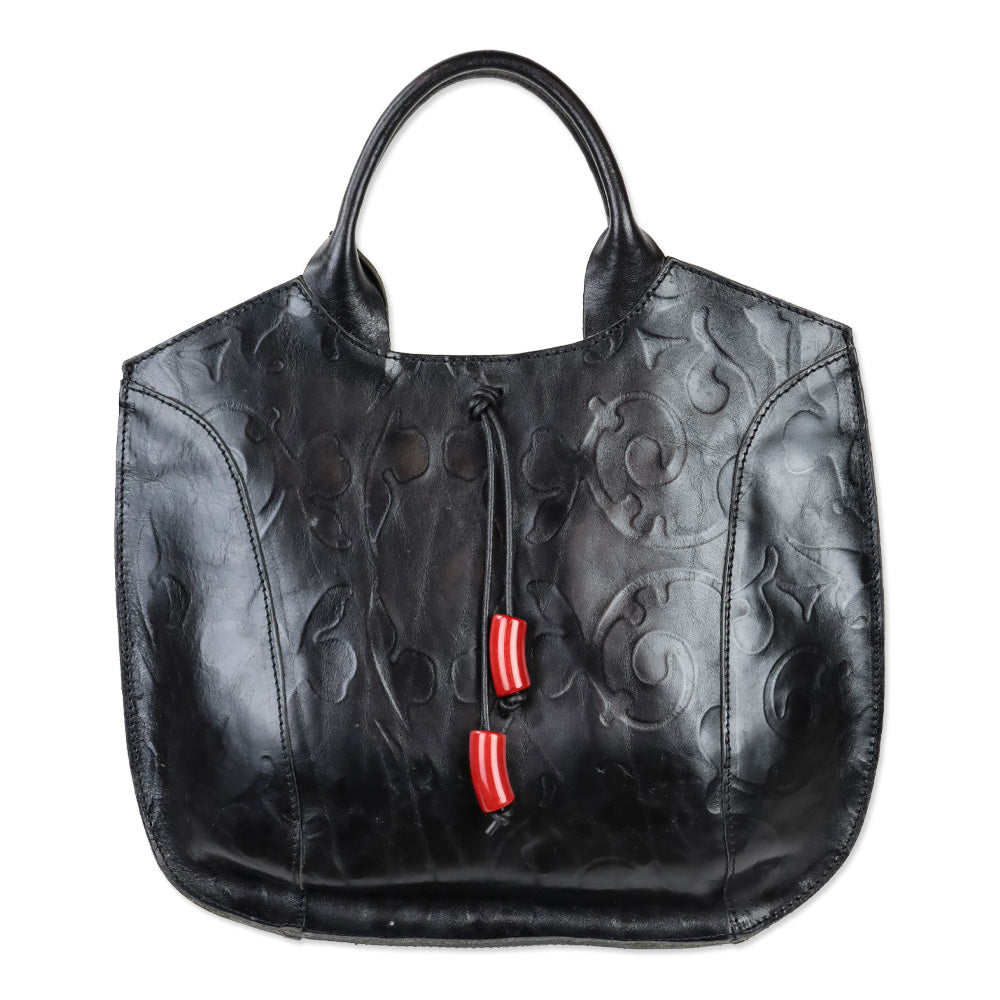 Christopher Kon Black Embossed Leather Tote with Red Stone Tassel