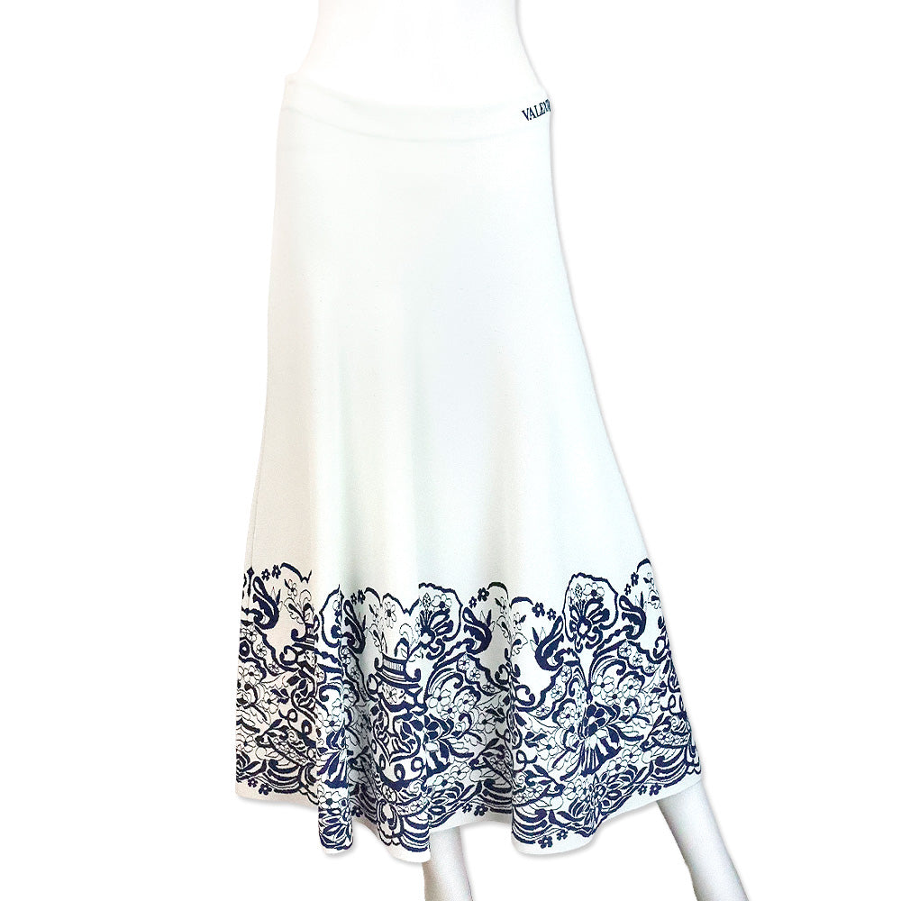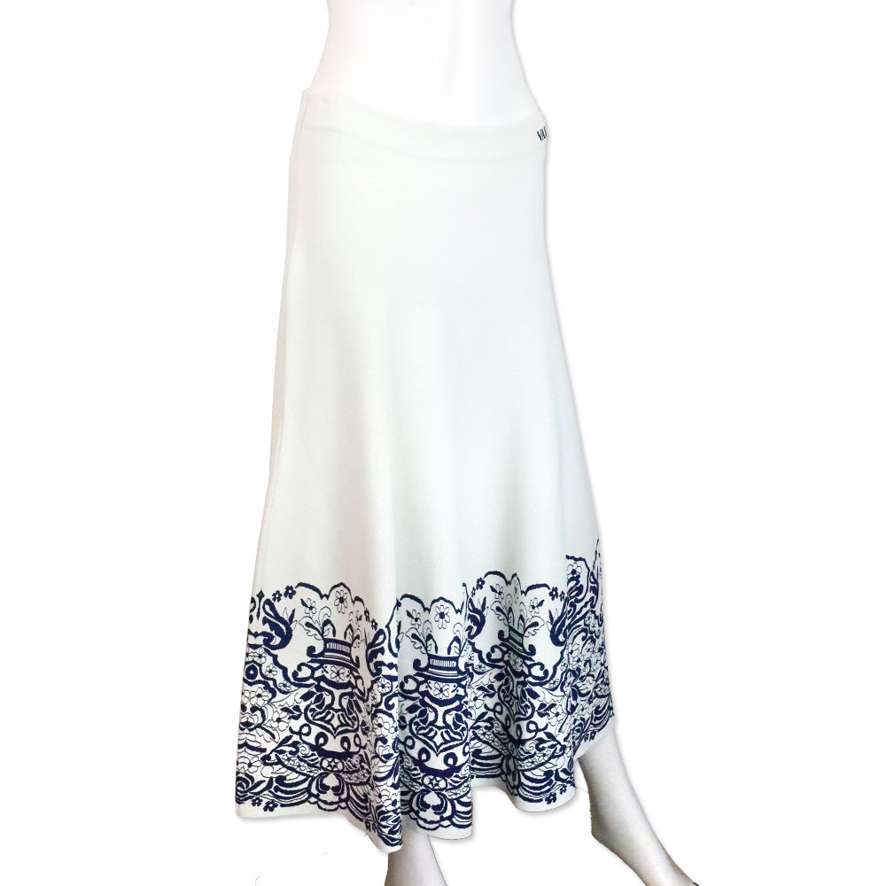 Valentino Garavani Ivory with Blue Floral Trim Print Stretch Jersey Flared Midi Skirt