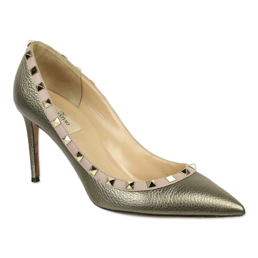 Valentino Garavani Metallic Pewter Grained Leather Rockstud Trim Pump